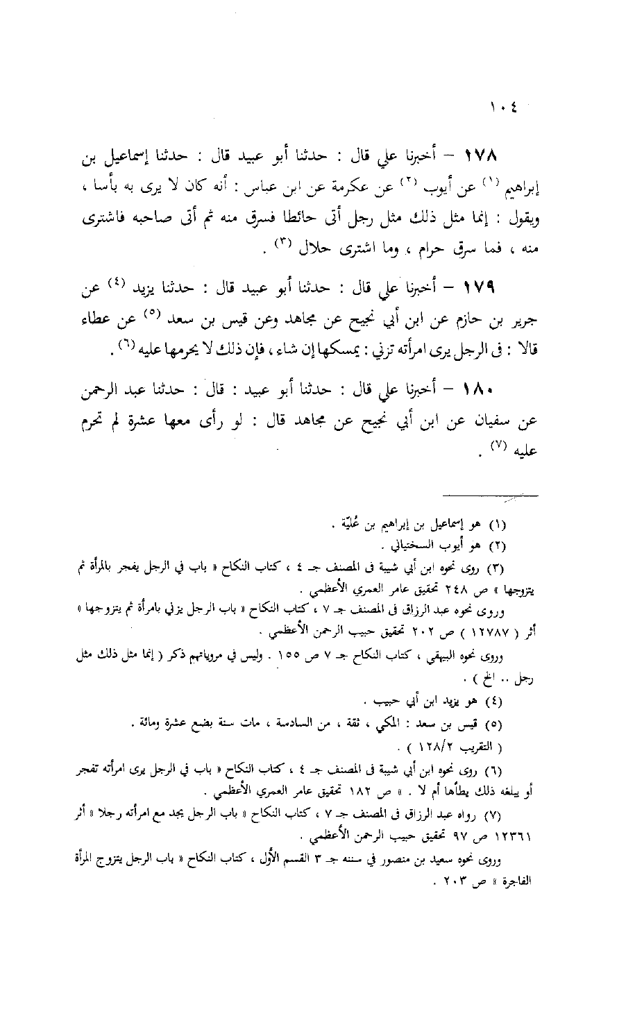 180 - أخبرنا علي قال: حدثنا أبو عبيد: قال: حدثنا عبد الرحمن عن سفيان عن ابن أبي نجيح عن مجاهد قال: لو رأى معها عشرة لم تحرم عليه (¬7).
