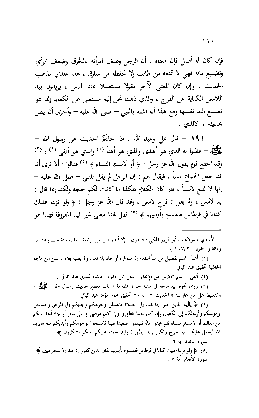 191 - قال علي وعبد الله: إذا جاءكم الحديث عن رسول الله- صلّى الله عليه وسلم- فظنوا به الذي هو أهدى والذي هو أهنأ (¬1) والذي هو أتقى (¬2)، (¬3) وقد احتج قوم بقول الله عز وجل: أَوْ لامَسْتُمُ النِّساءَ (¬4) فقالوا: ألا ترى أنه قد جعل الجماع لمسا، فيقال لهم: إن الرجل لم يقل للنبي- صلّى الله عليه- إنها لا تمنع لامسا، فلو كان الكلام هكذا ما كانت لكم حجة ولكنه إنما قال: