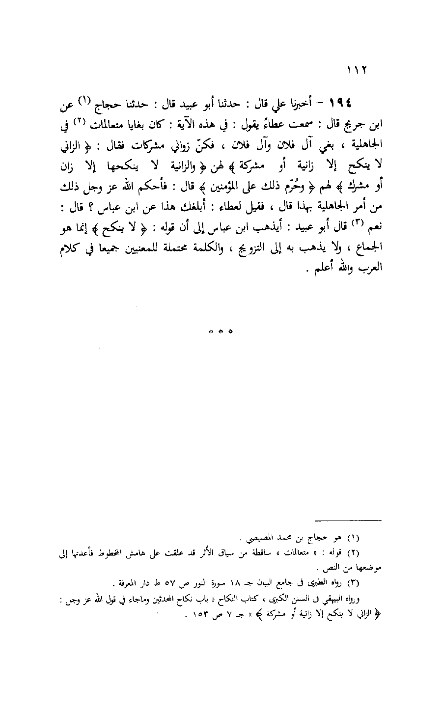 194 - أخبرنا علي قال: حدثنا أبو عبيد قال: حدثنا حجاج (¬1) عن ابن جريج قال: سمعت عطاء يقول: في هذه الآية: كان بغايا متعالمات (¬2) في الجاهلية، بغي آل فلان وآل فلان، فكنّ زواني مشركات فقال: الزَّانِي لا يَنْكِحُ إِلَّا زانِيَةً أَوْ مُشْرِكَةً لهن وَالزَّانِيَةُ لا يَنْكِحُها إِلَّا زانٍ أَوْ مُشْرِكٌ لهم وَحُرِّمَ ذلِكَ عَلَى الْمُؤْمِنِينَ قال: فأحكم الله عز وجل ذلك من أمر الجاهلية بهذا قال، فقيل لعطاء: أبلغك هذا عن ابن عباس؟ قال: