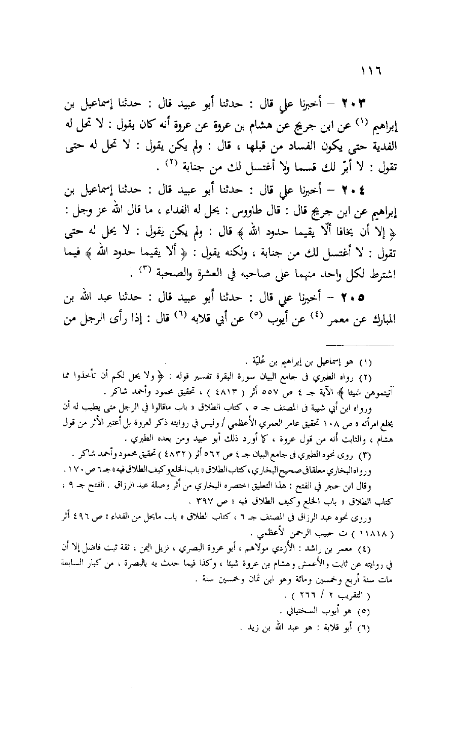 204 - أخبرنا علي قال: حدثنا أبو عبيد قال: حدثنا إسماعيل بن إبراهيم عن ابن جريج قال: قال طاوس: يحل له الفداء، ما قال الله عز وجل:
