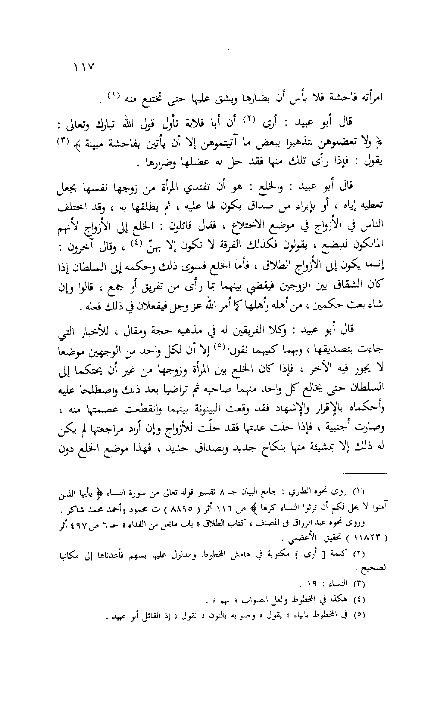 قال أبو عبيد: وكلا الفريقين له في مذهبه حجة ومقال، للأخبار التي جاءت بتصديقها، وبهما كليهما نقول (¬5) إلا أن لكل واحد من الوجهين موضعا لا يجوز فيه الآخر، فإذا كان الخلع بين المرأة وزوجها من غير أن يحتكما إلى السلطان حتى يخالع كل واحد منهما صاحبه ثم تراضيا بعد ذلك واصطلحا عليه وأحكماه بالإقرار والإشهاد فقد