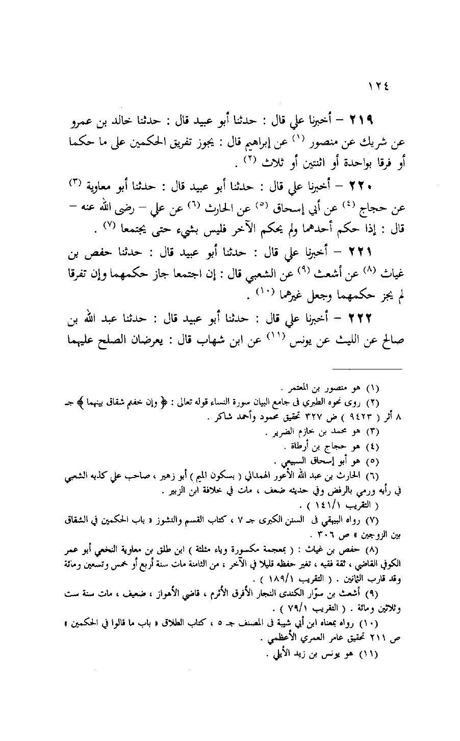 221 - أخبرنا علي قال: حدثنا أبو عبيد قال: حدثنا حفص بن غياث (¬8) عن أشعث (¬9) عن الشعبي قال: إن اجتمعا جاز حكمهما وإن تفرقا لم يجز حكمهما وجعل غيرهما (¬10).