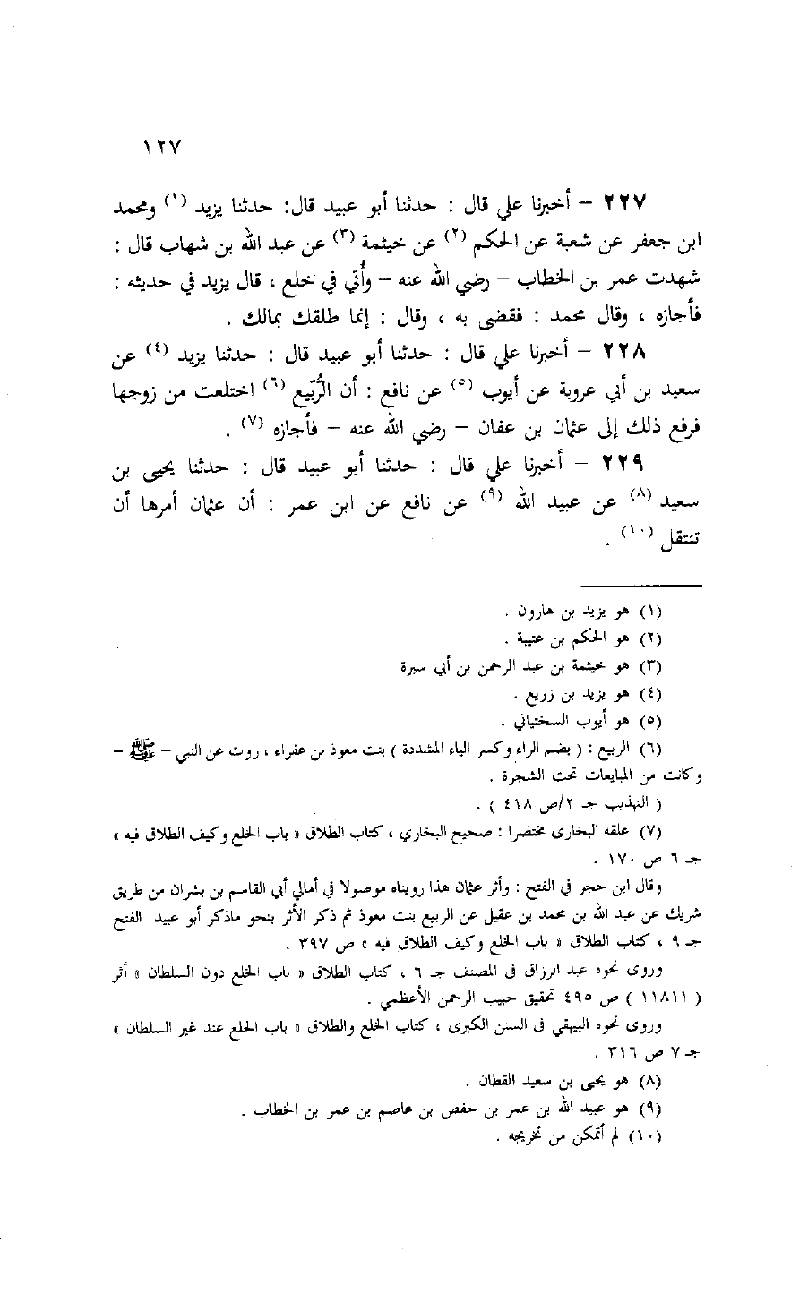 228 - أخبرنا علي قال: حدثنا أبو عبيد قال: حدثنا يزيد (¬4) عن سعيد بن أبي عروبة عن أيوب (¬5) عن نافع: أن الرّبيّع (¬6) اختلعت من زوجها فرفع ذلك إلى عثمان بن عفان- رضي الله عنه- فأجازه (¬7).