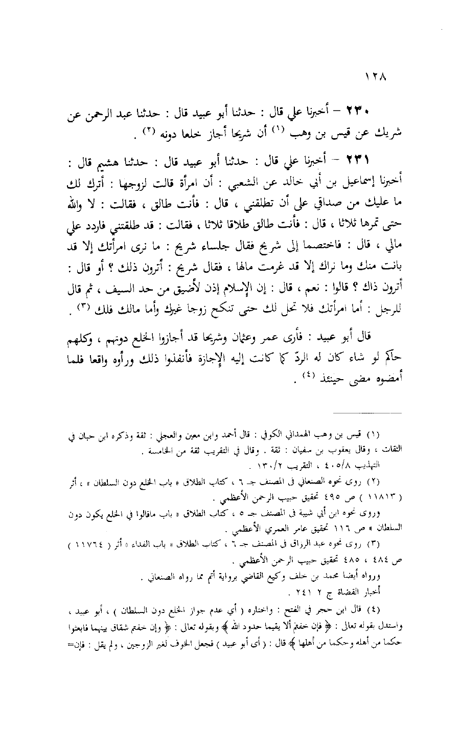 230 - أخبرنا علي قال: حدثنا أبو عبيد قال: حدثنا عبد الرحمن عن شريك عن قيس بن وهب (¬1) أن شريحا أجاز خلعا دونه (¬2).