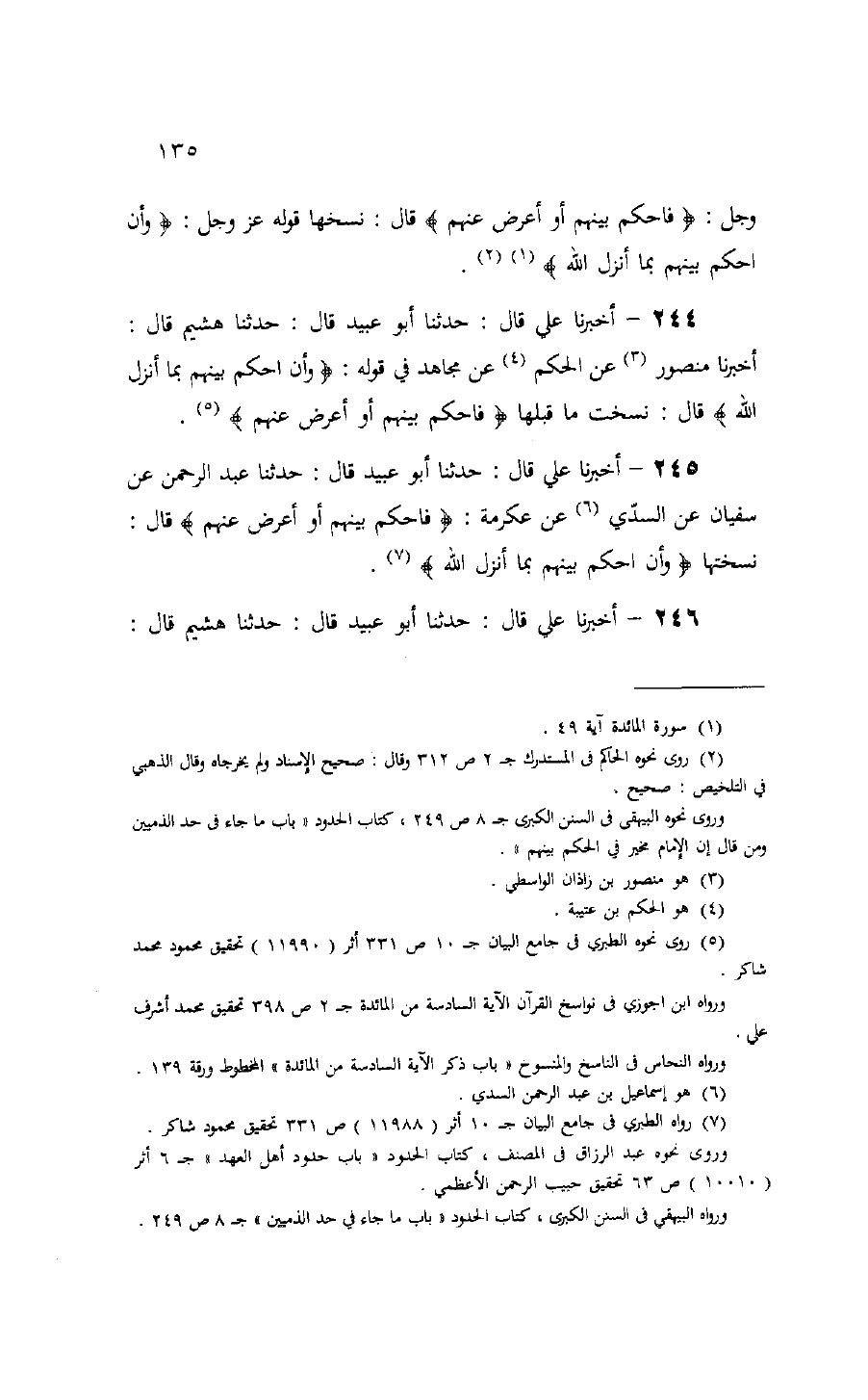 أخبرنا منصور (¬3) عن الحكم (¬4) عن مجاهد في قوله: وَأَنِ احْكُمْ بَيْنَهُمْ بِما أَنْزَلَ اللَّهُ قال: نسخت ما قبلها فَاحْكُمْ بَيْنَهُمْ أَوْ أَعْرِضْ عَنْهُمْ (¬5).