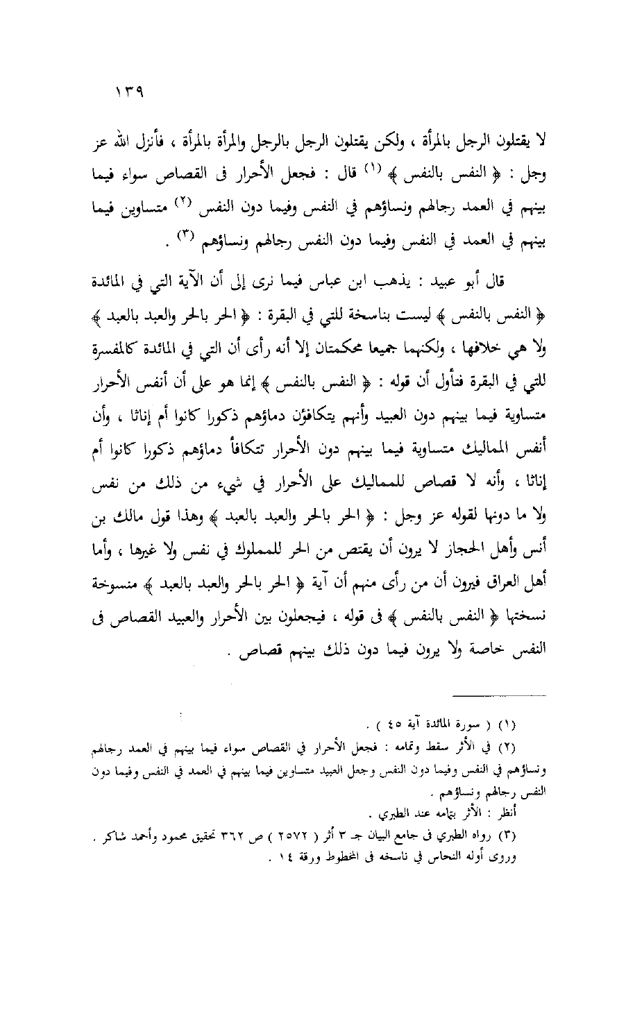 قال أبو عبيد: يذهب ابن عباس فيما نرى إلى أن الآية التي في المائدة النَّفْسَ بِالنَّفْسِ ليست بناسخة للتي في البقرة: الْحُرُّ بِالْحُرِّ وَالْعَبْدُ بِالْعَبْدِ ولا هي خلافها، ولكنهما جميعا محكمتان إلا أنه رأى أن التي في المائدة كالمفسرة للتي في البقرة فتأول أن قوله: النَّفْسَ بِالنَّفْسِ إنما هو على أن أنفس الأحرار متساوية فيما بينهم دون العبيد وأنهم يتكافئون دماؤهم ذكورا كانوا أم إناثا، وأن أنفس المماليك متساوية فيما بينهم دون الأحرار تتكافأ دماؤهم ذكورا كانوا أم إناثا، وأنه لا قصاص للمماليك على الأحرار في شيء من ذلك من نفس ولا ما دونها لقوله عز وجل: الْحُرُّ بِالْحُرِّ وَالْعَبْدُ بِالْعَبْدِ وهذا قول مالك بن أنس وأهل الحجاز لا يرون أن يقتص من الحر للمملوك في نفس ولا غيرها، وأما أهل العراق فيرون أن من رأى منهم أن آية الْحُرُّ بِالْحُرِّ وَالْعَبْدُ بِالْعَبْدِ منسوخة نسختها النَّفْسَ بِالنَّفْسِ فى قوله، فيجعلون بين الأحرار والعبيد القصاص فى النفس خاصة ولا يرون فيما دون ذلك بينهم قصاص.