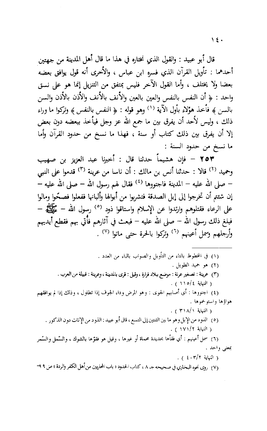 253 - فإن هشيما حدثنا قال: أخبرنا عبد العزيز بن صهيب وحميد (¬2) قالا: حدثنا أنس بن مالك: أن ناسا من عرينة (¬3) قدموا على النبي- صلّى الله عليه- المدينة فاجتووها (¬4) فقال لهم رسول الله- صلّى الله عليه- إن شئتم أن تخرجوا إلى إبل الصدقة فتشربوا من أبوالها وألبانها ففعلوا فصحّوا ومالوا على الرعاء فقتلوهم وارتدوا عن الإسلام واستاقوا ذود (¬5) رسول الله- صلّى الله عليه وسلم- فبلغ ذلك رسول الله- صلّى الله عليه- فبعث في آثارهم فأتي بهم فقطع أيديهم وأرجلهم وسمل أعينهم (¬6) وتركوا بالحرة حتى ماتوا (¬7).
