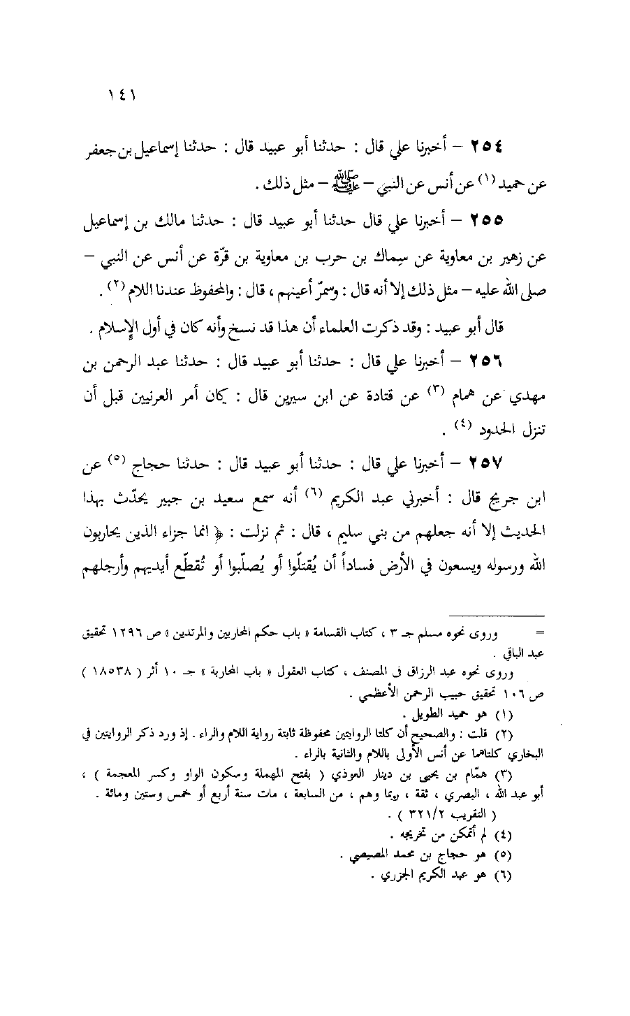 257 - أخبرنا علي قال: حدثنا أبو عبيد قال: حدثنا حجاج (¬5) عن ابن جريج قال: أخبرني عبد الكريم (¬6) أنه سمع سعيد بن جبير يحدّث بهذا الحديث إلا أنه جعلهم من بني سليم، قال: ثم نزلت: إِنَّما جَزاءُ الَّذِينَ يُحارِبُونَ اللَّهَ وَرَسُولَهُ وَيَسْعَوْنَ فِي الْأَرْضِ فَساداً أَنْ يُقَتَّلُوا أَوْ يُصَلَّبُوا أَوْ تُقَطَّعَ أَيْدِيهِمْ وَأَرْجُلُهُمْ