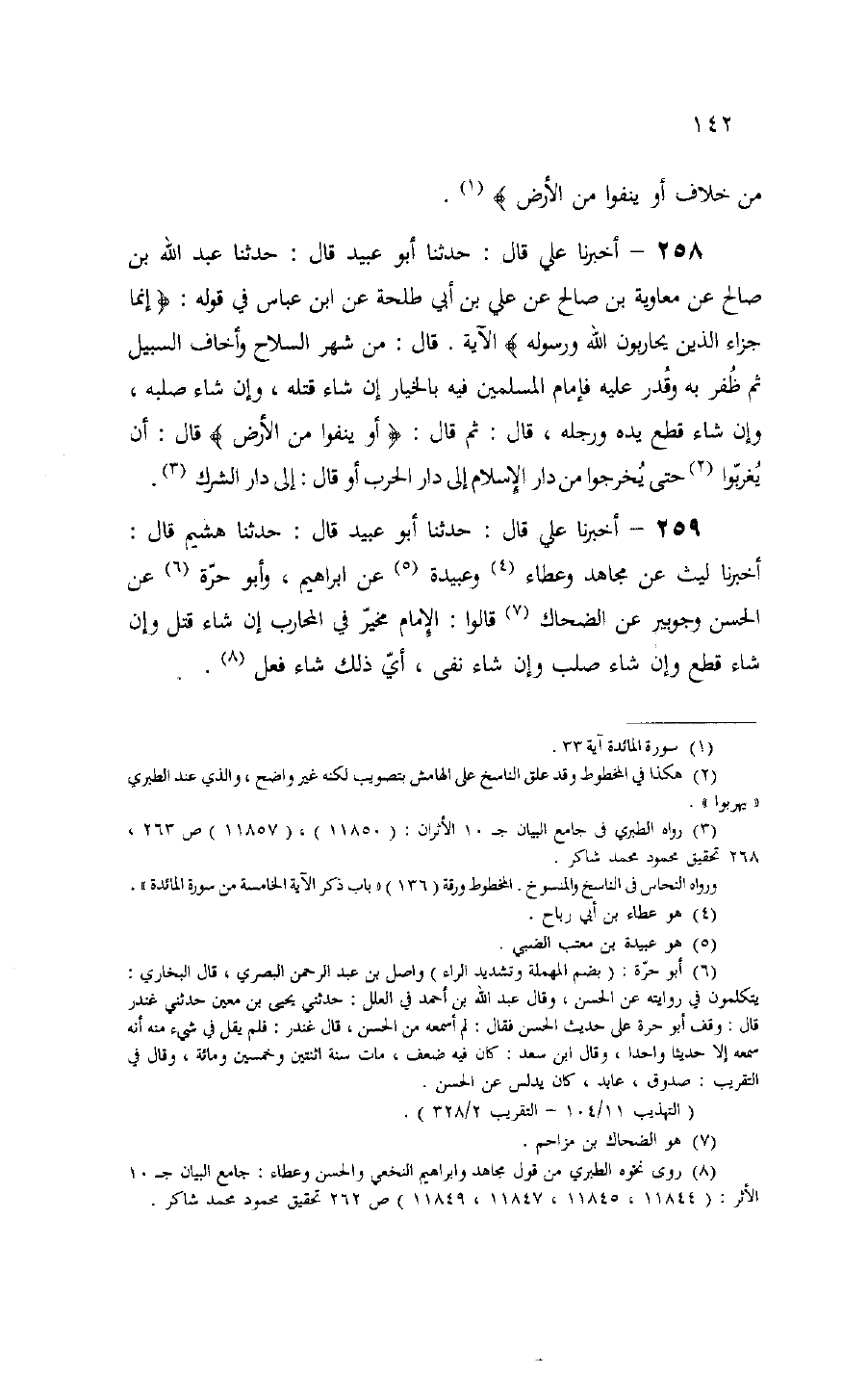 258 - أخبرنا علي قال: حدثنا أبو عبيد قال: حدثنا عبد الله بن صالح عن معاوية بن صالح عن علي بن أبي طلحة عن ابن عباس في قوله: إِنَّما جَزاءُ الَّذِينَ يُحارِبُونَ اللَّهَ