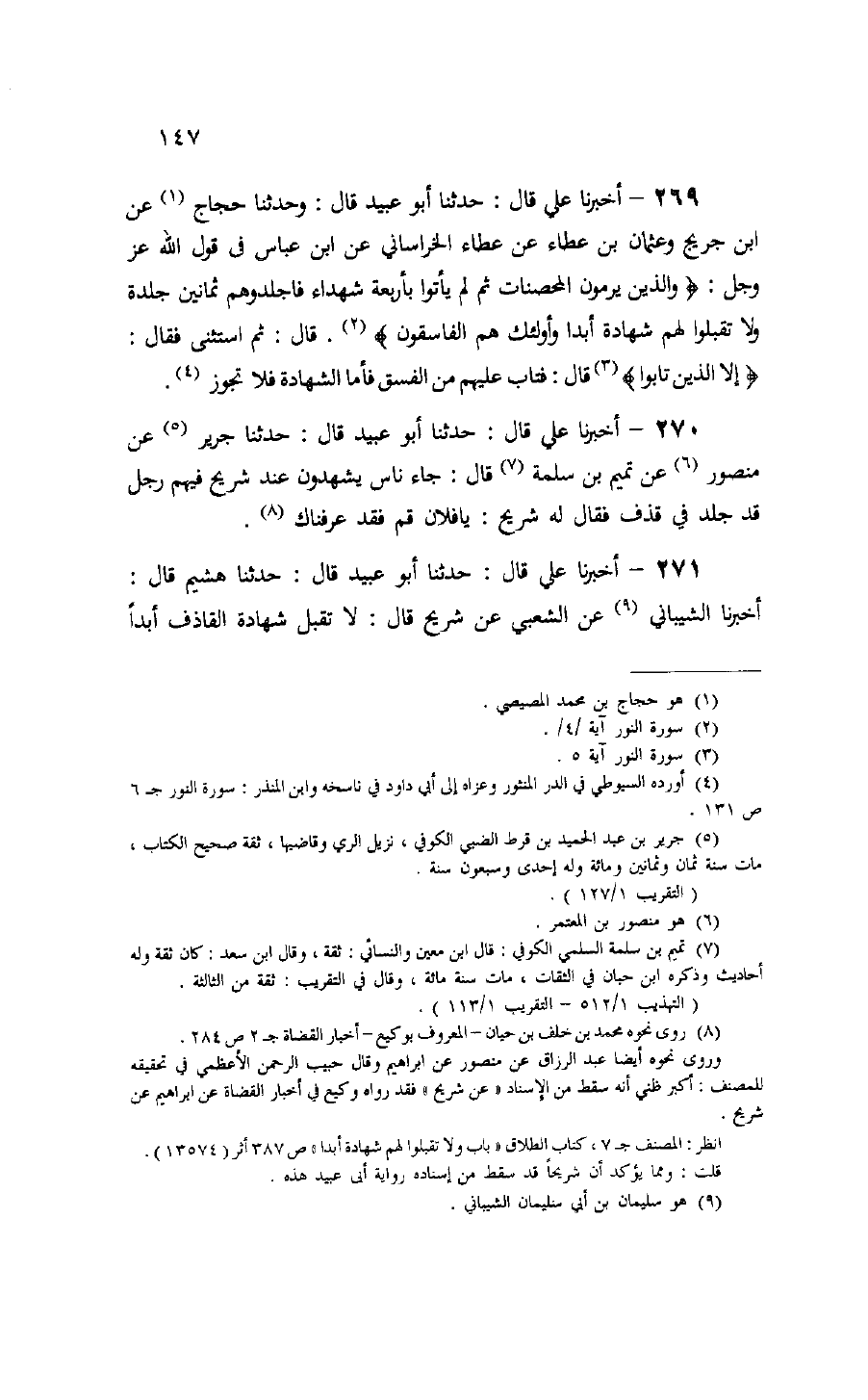 270 - أخبرنا علي قال: حدثنا أبو عبيد قال: حدثنا جرير (¬5) عن منصور (¬6) عن تميم بن سلمة (¬7) قال: جاء ناس يشهدون عند شريح فيهم رجل قد جلد في قذف فقال له شريح: يا فلان قم فقد عرفناك (¬8).