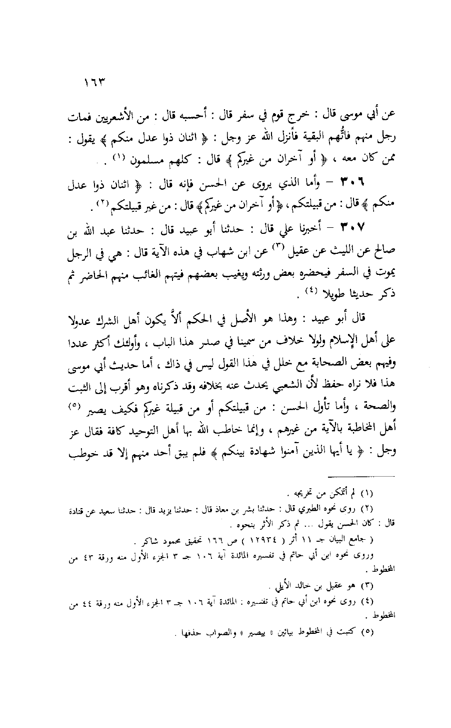 306 - وأما الذي يروى عن الحسن فإنه قال: اثْنانِ ذَوا عَدْلٍ مِنْكُمْ قال: من قبيلتكم، أَوْ آخَرانِ مِنْ غَيْرِكُمْ قال: من غير قبيلتكم (¬2).
