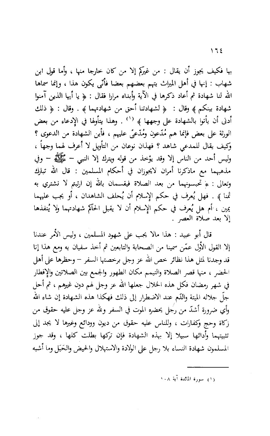 قال أبو عبيد: هذا ما لا يجب على شهود المسلمين، وليس الأمر عندنا إلا القول الأول عمّن سمينا من الصحابة والتابعين ثم أخذ سفيان به ومع هذا إنا قد وجدنا لمثل هذا نظائر خص الله عز وجل برخصتها السفر- وحظرها على أهل الحضر، منها قصر الصلاة والتيمم مكان الطهور والجمع بين الصلاتين والإفطار في شهر رمضان فكل هذه الخلال جعلها الله عز وجل لهم دون غيرهم، ثم أحل جلّ جلاله الميتة والدّم عند الاضطرار إلى ذلك فهكذا هذه الشهادة إن شاء الله وأي ضرورة أشدّ من رجل يحضره الموت في السفر ولله عز وجل عليه حقوق من زكاة وحج وكفارات، وللناس عليه حقوق من ديون وودائع وغيرها لا يجد إلى تثبيتهما وأدائها سبيلا إلا بهذه الشهادة فإن تركها بطلت كلها، وقد جوز المسلمون شهادة النساء بلا رجل على الولادة والاستهلال والحيض والحبل وما أشبه