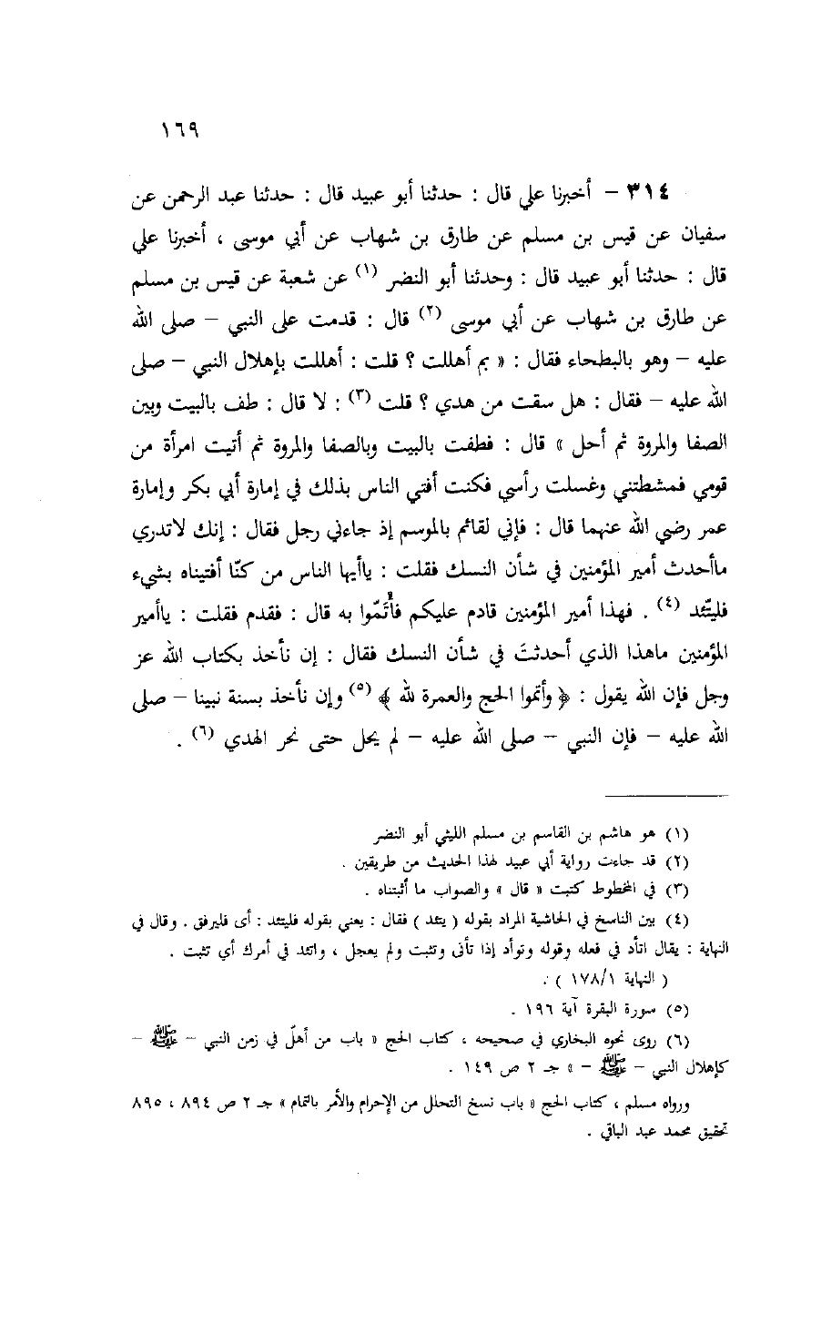 314 - أخبرنا علي قال: حدثنا أبو عبيد قال: حدثنا عبد الرحمن عن سفيان عن قيس بن مسلم عن طارق بن شهاب عن أبي موسى، أخبرنا علي قال: حدثنا أبو عبيد قال: وحدثنا أبو النضر (¬1) عن شعبة عن قيس بن مسلم عن طارق بن شهاب عن أبي موسى (¬2) قال: قدمت على النبي- صلّى الله عليه- وهو بالبطحاء فقال: «بم أهللت؟ قلت: أهللت بإهلال النبي- صلّى الله عليه- فقال: هل سقت من هدي؟ قلت (¬3): لا قال: طف بالبيت وبين الصفا والمروة ثم أحل» قال: فطفت بالبيت وبالصفا والمروة ثم أتيت امرأة من قومي فمشطتني وغسلت رأسي فكنت أفتي الناس بذلك في إمارة أبي بكر وإمارة عمر رضي الله عنهما قال: فإني لقائم بالموسم إذ جاءني رجل فقال: إنك لا تدري ما أحدث أمير المؤمنين في شأن النسك فقلت: يا أيها الناس من كنّا أفتيناه بشيء فليتّئذ (¬4). فهذا أمير المؤمنين قادم عليكم فأتمّوا به قال: فقدم فقلت: يا أمير المؤمنين ما هذا الذي أحدثت في شأن النسك فقال: إن نأخذ بكتاب الله عز وجل فإن الله يقول: وَأَتِمُّوا الْحَجَّ وَالْعُمْرَةَ لِلَّهِ (¬5) وإن نأخذ بسنة نبينا- صلّى الله عليه- فإن النبي- صلّى الله عليه- لم يحل حتى نحر الهدي (¬6).