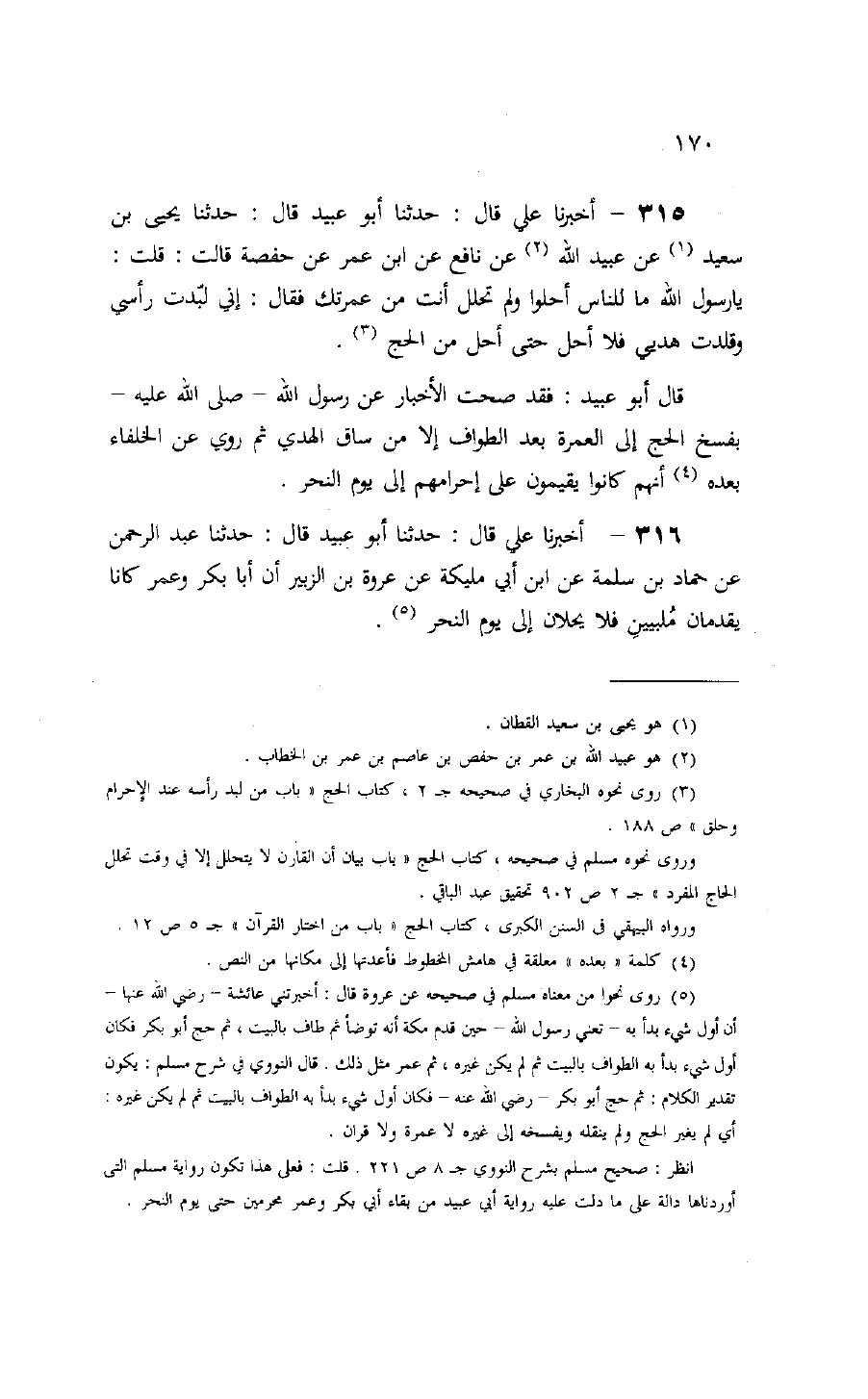 316 - أخبرنا علي قال: حدثنا أبو عبيد قال: حدثنا عبد الرحمن عن حماد بن سلمة عن ابن أبي مليكة عن عروة بن الزبير أن أبا بكر وعمر كانا يقدمان ملبيين فلا يحلان إلى يوم النحر (¬5).