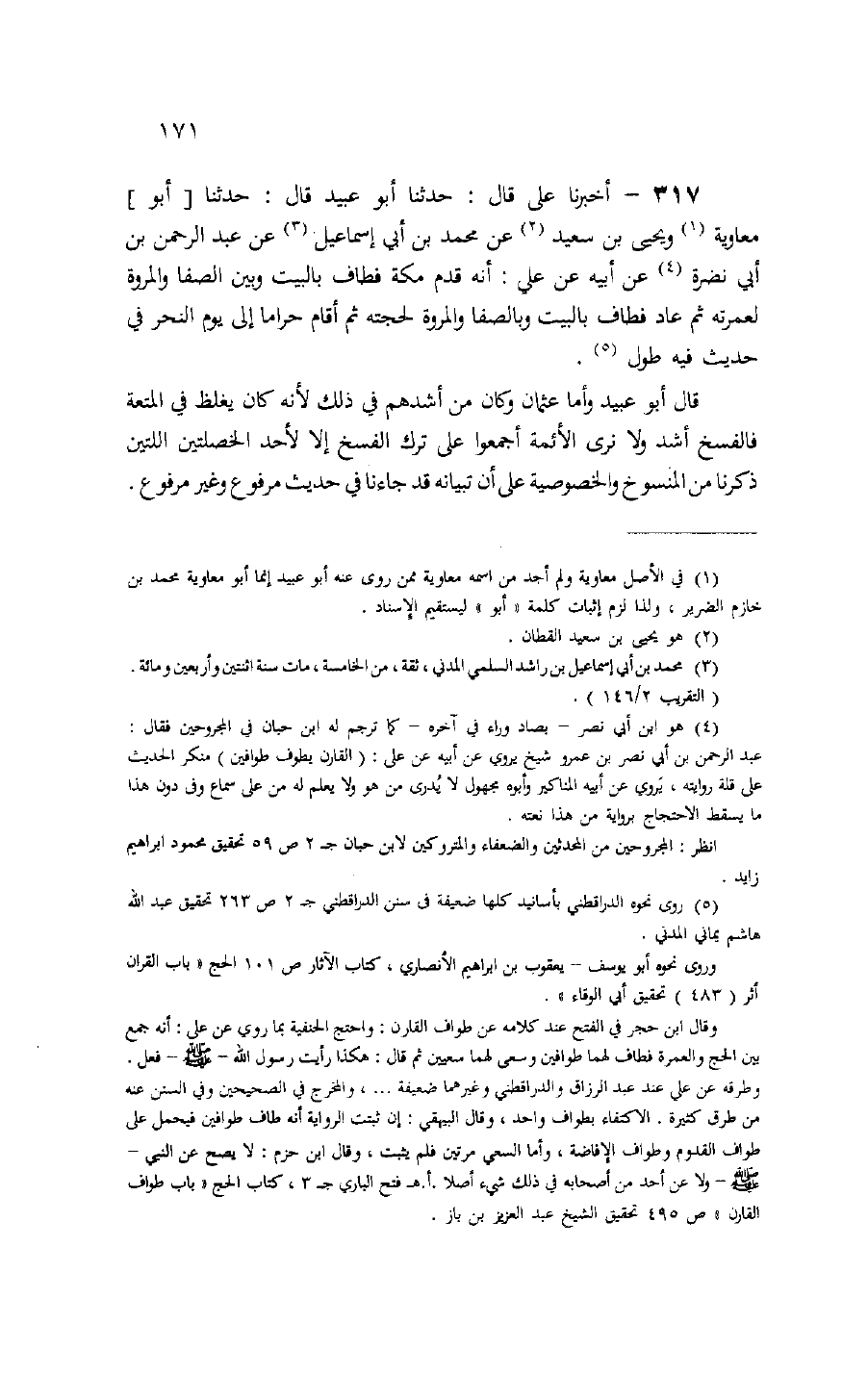 317 - أخبرنا على قال: حدثنا أبو عبيد قال: حدثنا [أبو] معاوية (¬1) ويحيى بن سعيد (¬2) عن محمد بن أبي إسماعيل (¬3) عن عبد الرحمن بن أبي نضرة (¬4) عن أبيه عن علي: أنه قدم مكة فطاف بالبيت وبين الصفا والمروة لعمرته ثم عاد فطاف بالبيت وبالصفا والمروة لحجته ثم أقام حراما إلى يوم النحر في حديث فيه طول (¬5).