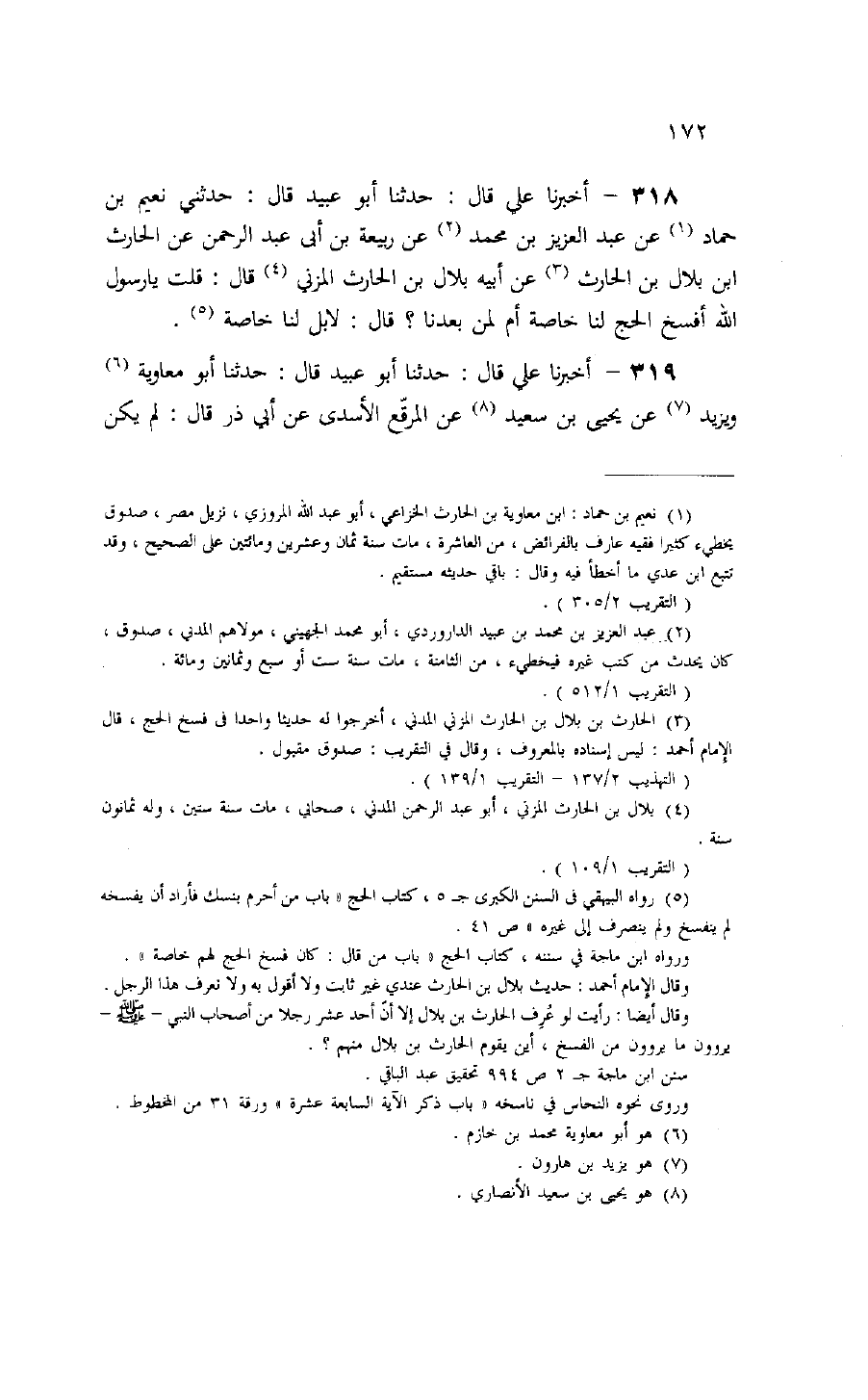 318 - أخبرنا علي قال: حدثنا أبو عبيد قال: حدثني نعيم بن حماد (¬1) عن عبد العزيز بن محمد (¬2) عن ربيعة بن أبي عبد الرحمن عن الحارث ابن بلال بن الحارث (¬3) عن أبيه بلال بن الحارث المزني (¬4) قال: قلت يا رسول الله أفسخ الحج لنا خاصة أم لمن بعدنا؟ قال: لا بل لنا خاصة (¬5).