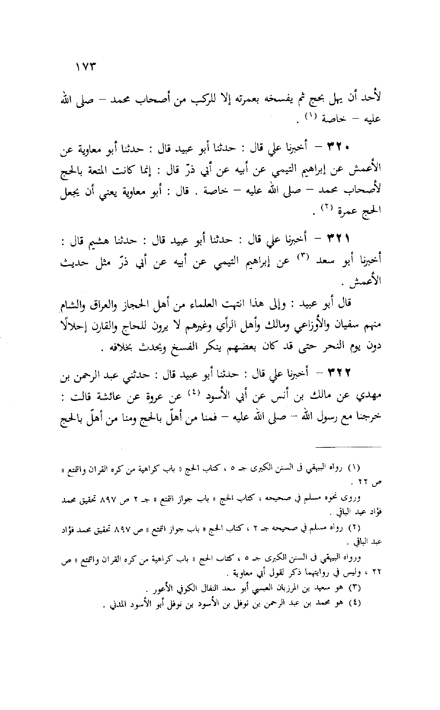 320 - أخبرنا علي قال: حدثنا أبو عبيد قال: حدثنا أبو معاوية عن الأعمش عن إبراهيم التيمي عن أبيه عن أبي ذرّ قال: إنما كانت المتعة بالحج لأصحاب محمد- صلّى الله عليه- خاصة. قال: أبو معاوية يعني أن يجعل الحج عمرة (¬2).