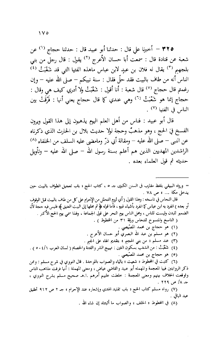325 - أخبرنا علي قال: حدثنا أبو عبيد قال: حدثنا حجاج (¬1) عن شعبة عن قتادة قال: سمعت أبا حسان الأعرج (¬2) يقول: قال رجل من بني بلجهيم (¬3) يقال له فلان بن عبد لابن عباس ما هذه الفتيا التي قد شغبت (¬4) الناس أنه من طاف بالبيت فقد حلّ فقال: سنة نبيكم- صلّى الله عليه- وإن رغمتم قال حجاج (¬5) قال شعبة: أنا أقول: شغبت ولا أدري كيف هي وقال: