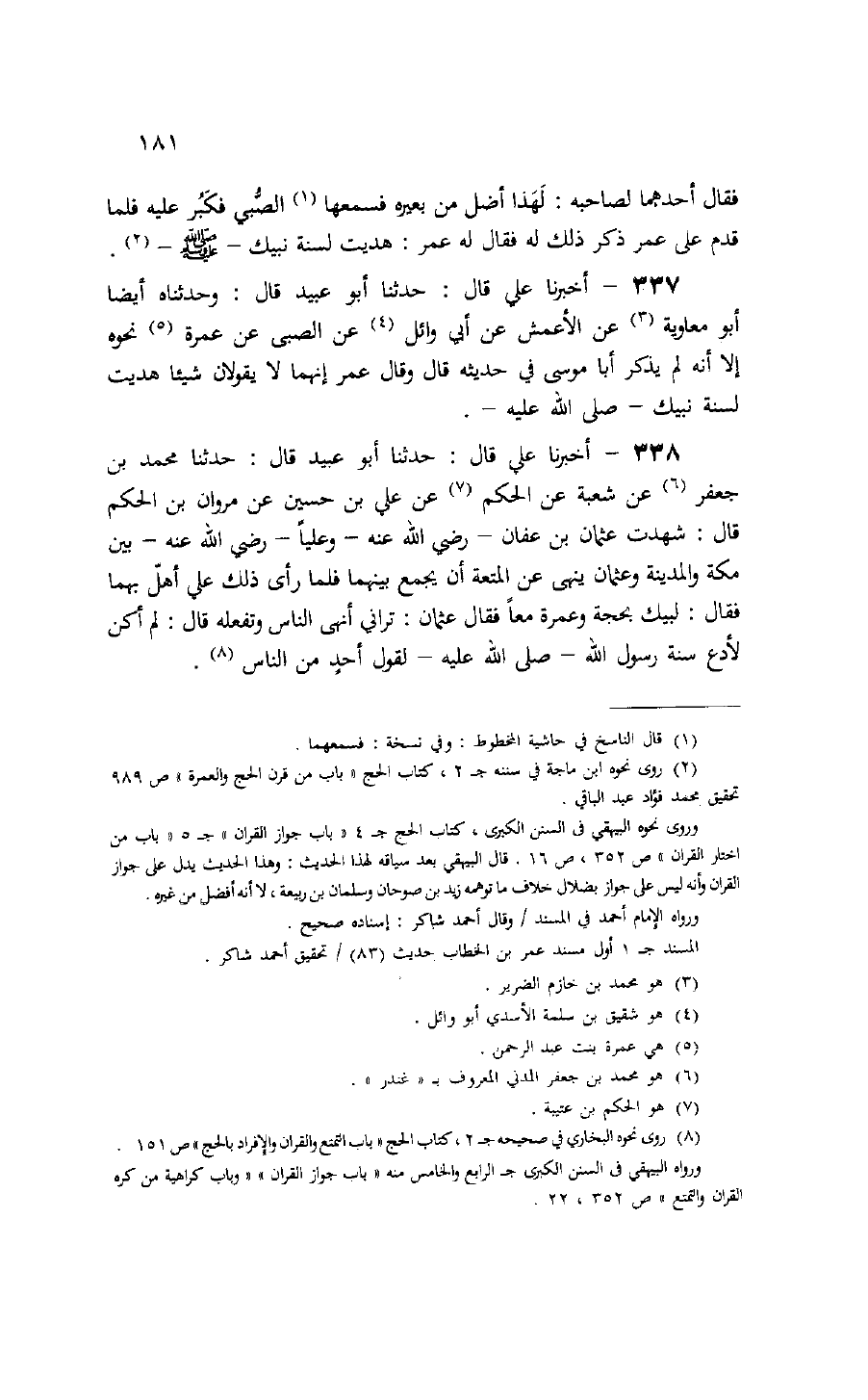 وروى نحوه البيهقي فى السنن الكبرى، كتاب الحج ج 4 «باب جواز القران» ج 5 «باب من اختار القران» ص 352، ص 16. قال البيهقي بعد سياقه لهذا الحديث: وهذا الحديث يدل على جواز القران وأنه ليس على جواز بضلال خلاف ما توهمه زيد بن صوحان وسلمان بن ربيعة، لا أنه أفضل من غيره.