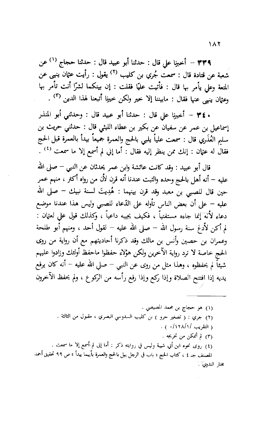 340 - أخبرنا علي قال: حدثنا أبو عبيد قال: وحدثني أبو المنذر إسماعيل بن عمر عن سفيان عن بكير بن عطاء الليثي قال: حدثني حريث بن سليم العذري قال: سمعت عليا يلبي بالحج والعمرة جميعا يبدأ بالعمرة قبل الحج فقال له عثمان: إنك ممن ينظر إليه فقال: أما إني لم أسمع إلا ما سمعت (¬4).