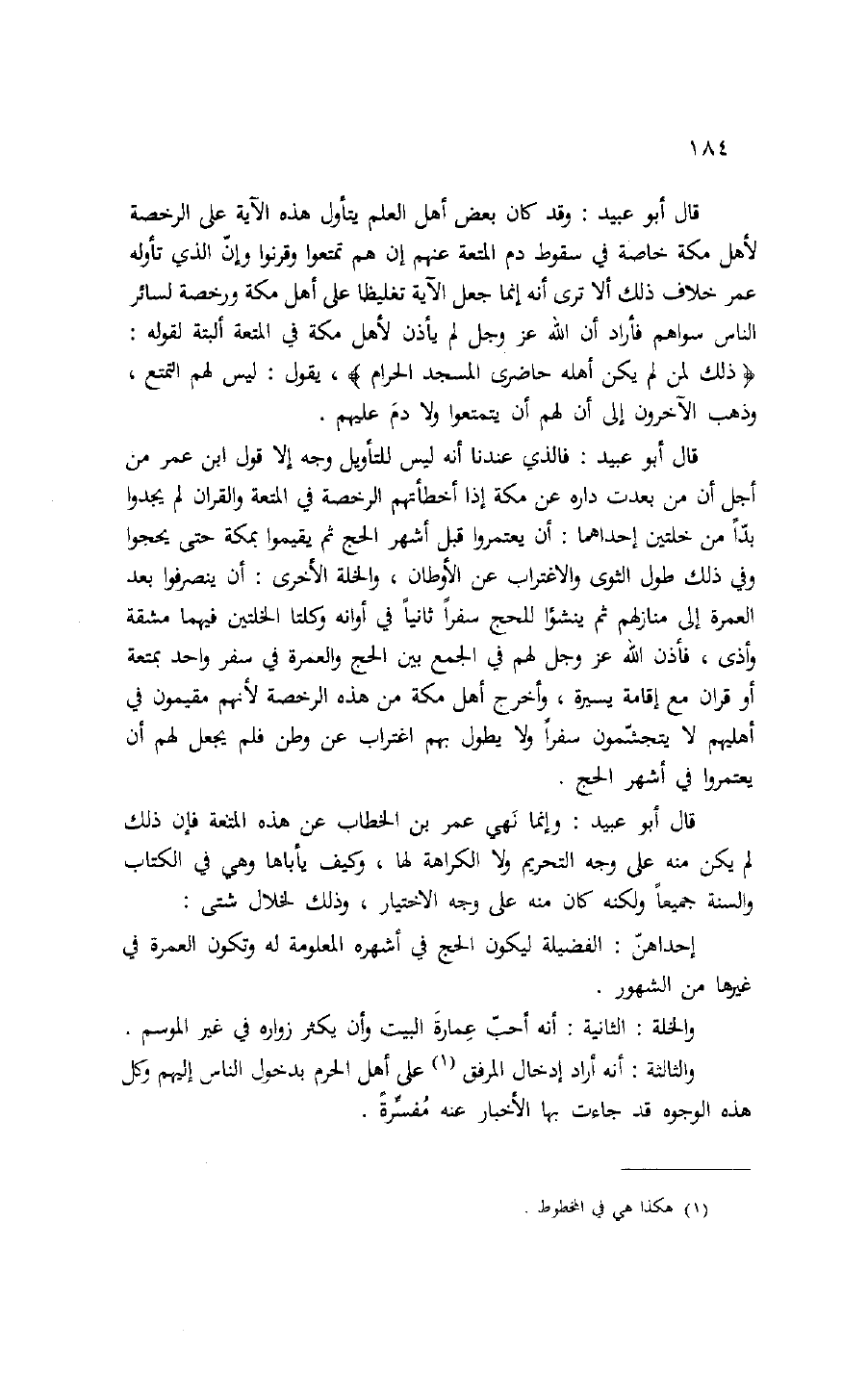 قال أبو عبيد: فالذي عندنا أنه ليس للتأويل وجه إلا قول ابن عمر من أجل أن من بعدت داره عن مكة إذا أخطأتهم الرخصة في المتعة والقران لم يجدوا بدّا من خلتين إحداهما: أن يعتمروا قبل أشهر الحج ثم يقيموا بمكة حتى يحجوا وفي ذلك طول الثوى والاغتراب عن الأوطان، والخلة الأخرى: أن ينصرفوا بعد العمرة إلى منازلهم ثم ينشؤا للحج سفرا ثانيا في أوانه وكلتا الخلتين فيهما مشقة وأذى، فأذن الله عز وجل لهم في الجمع بين الحج والعمرة في سفر واحد بمتعة أو قران مع إقامة يسيرة، وأخرج أهل مكة من هذه الرخصة لأنهم مقيمون في أهليهم لا يتجشّمون سفرا ولا يطول بهم اغتراب عن وطن فلم يجعل لهم أن يعتمروا في أشهر الحج.