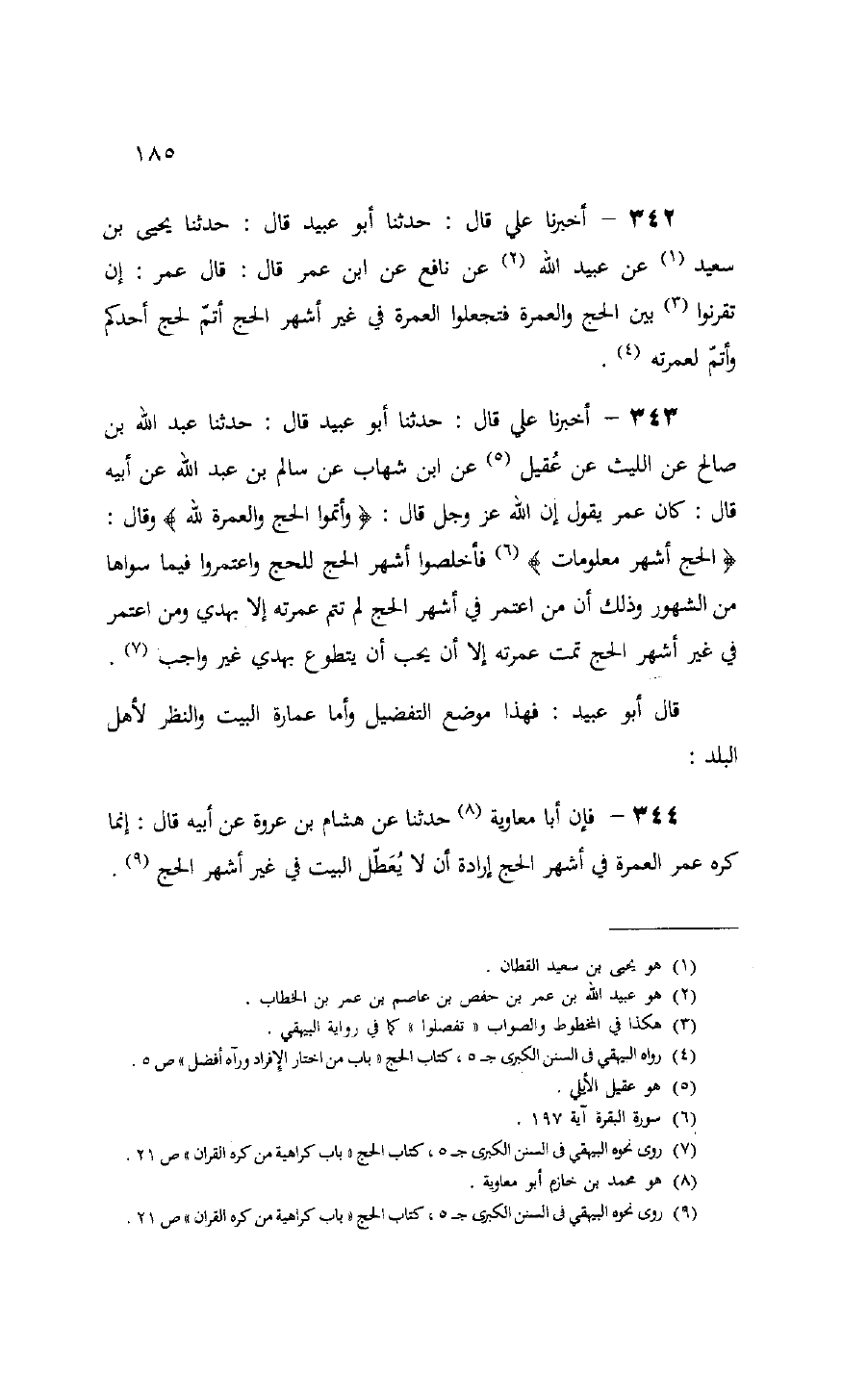 342 - أخبرنا علي قال: حدثنا أبو عبيد قال: حدثنا يحيى بن سعيد (¬1) عن عبيد الله (¬2) عن نافع عن ابن عمر قال: قال عمر: إن تقرنوا (¬3) بين الحج والعمرة فتجعلوا العمرة في غير أشهر الحج أتمّ لحج أحدكم وأتمّ لعمرته (¬4).