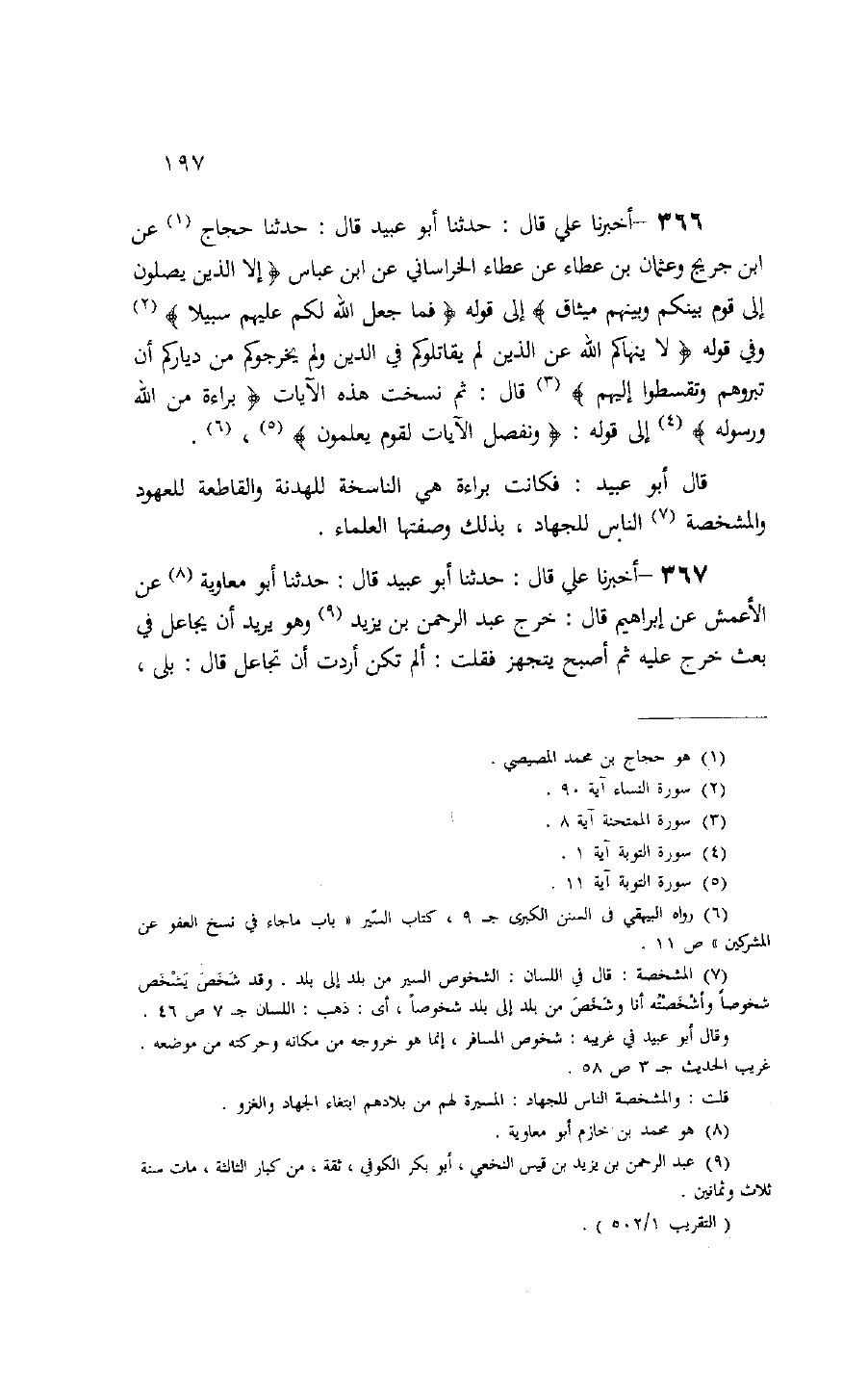 366 - أخبرنا علي قال: حدثنا أبو عبيد قال: حدثنا حجاج (¬1) عن ابن جريج وعثمان بن عطاء عن عطاء الخراساني عن ابن عباس إِلَّا الَّذِينَ يَصِلُونَ إِلى قَوْمٍ بَيْنَكُمْ وَبَيْنَهُمْ مِيثاقٌ إلى قوله فَما جَعَلَ اللَّهُ لَكُمْ عَلَيْهِمْ سَبِيلًا (¬2) وفي قوله لا يَنْهاكُمُ اللَّهُ عَنِ الَّذِينَ لَمْ يُقاتِلُوكُمْ فِي الدِّينِ وَلَمْ يُخْرِجُوكُمْ مِنْ دِيارِكُمْ أَنْ تَبَرُّوهُمْ وَتُقْسِطُوا إِلَيْهِمْ (¬3) قال: ثم نسخت هذه الآيات بَراءَةٌ مِنَ اللَّهِ وَرَسُولِهِ (¬4) إلى قوله: وَنُفَصِّلُ الْآياتِ لِقَوْمٍ يَعْلَمُونَ (¬5)، (¬6).