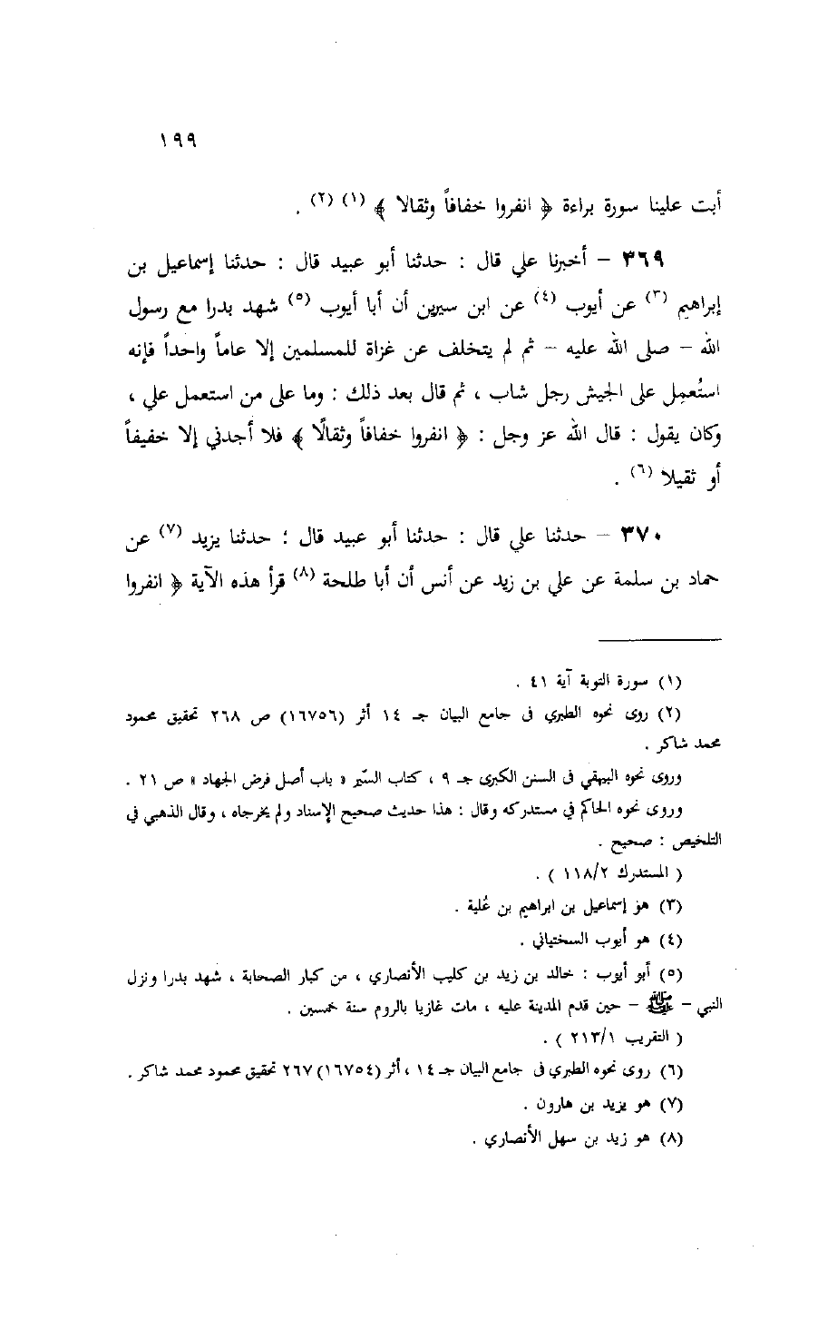 369 - أخبرنا علي قال: حدثنا أبو عبيد قال: حدثنا إسماعيل بن إبراهيم (¬3) عن أيوب (¬4) عن ابن سيرين أن أبا أيوب (¬5) شهد بدرا مع رسول الله- صلى الله عليه- ثم لم يتخلف عن غزاة للمسلمين إلا عاما واحدا فإنه استعمل على الجيش رجل شاب، ثم قال بعد ذلك: وما على من استعمل علي، وكان يقول: قال الله عز وجل: انْفِرُوا خِفافاً وَثِقالًا فلا أجدني إلا خفيفا أو ثقيلا (¬6).