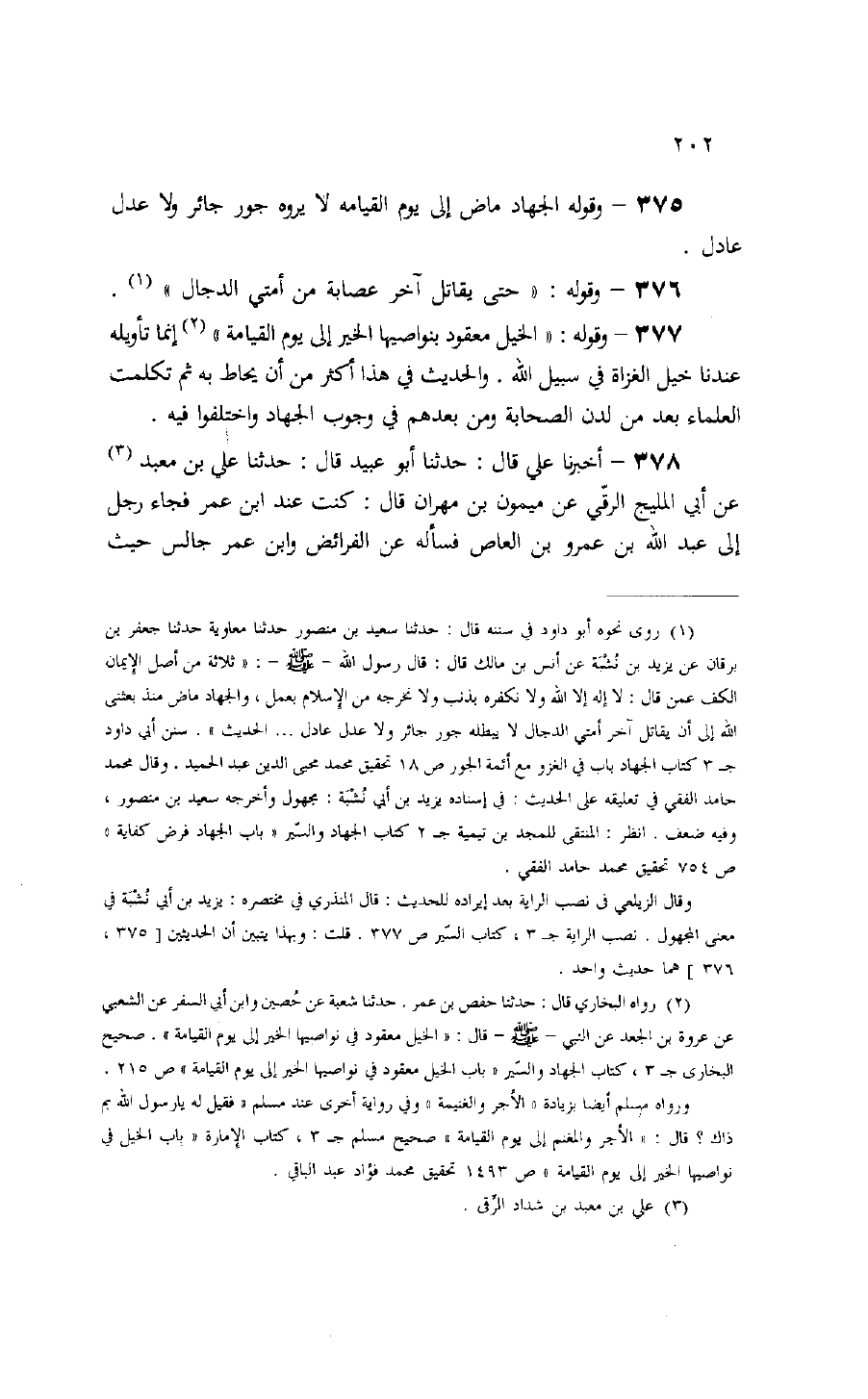 (¬2) رواه البخاري قال: حدثنا حفص بن عمر. حدثنا شعبة عن حصين وابن أبي السفر عن الشعبي عن عروة بن الجعد عن النبي- صلّى الله عليه وسلم- قال: «الخيل معقود في نواصيها الخير إلى يوم القيامة». صحيح البخارى ج 3، كتاب الجهاد والسّير «باب الخيل معقود في نواصيها الخير إلى يوم القيامة» ص 215.