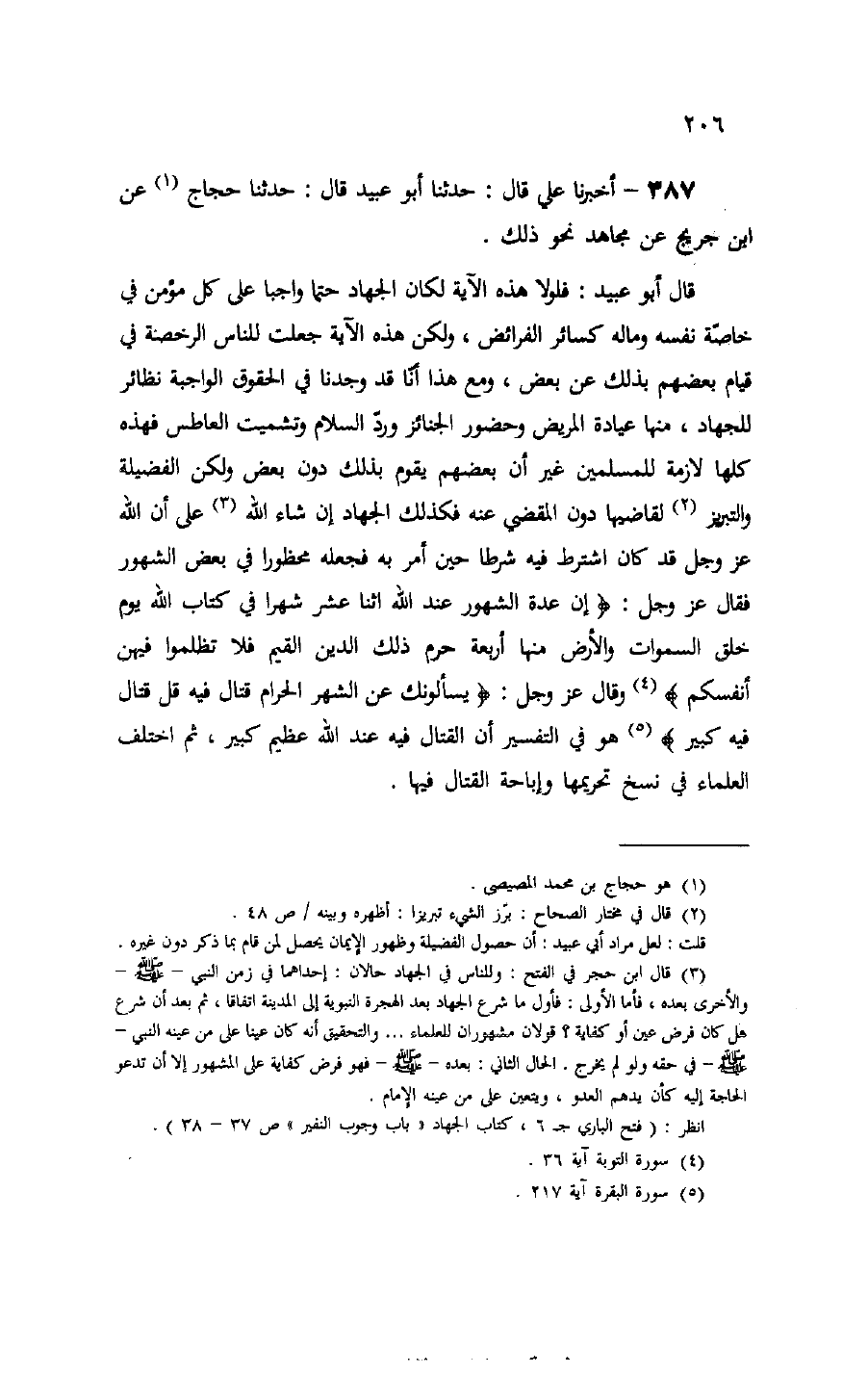 قال أبو عبيد: فلولا هذه الآية لكان الجهاد حتما واجبا على كل مؤمن في خاصّة نفسه وماله كسائر الفرائض، ولكن هذه الآية جعلت للناس الرخصة في قيام بعضهم بذلك عن بعض، ومع هذا أنّا قد وجدنا في الحقوق الواجبة نظائر للجهاد، منها عيادة المريض وحضور الجنائز وردّ السلام وتشميت العاطس فهذه كلها لازمة للمسلمين غير أن بعضهم يقوم بذلك دون بعض ولكن الفضيلة والتبريز (¬2) لقاضيها دون المقضي عنه فكذلك الجهاد إن شاء الله (¬3) على أن الله عز وجل قد كان اشترط فيه شرطا حين أمر به فجعله محظورا في بعض الشهور فقال عز وجل: إِنَّ عِدَّةَ الشُّهُورِ عِنْدَ اللَّهِ اثْنا عَشَرَ شَهْراً فِي كِتابِ اللَّهِ يَوْمَ خَلَقَ السَّماواتِ وَالْأَرْضَ مِنْها أَرْبَعَةٌ حُرُمٌ ذلِكَ الدِّينُ الْقَيِّمُ فَلا تَظْلِمُوا فِيهِنَّ أَنْفُسَكُمْ (¬4) وقال عز وجل: يَسْئَلُونَكَ عَنِ الشَّهْرِ الْحَرامِ قِتالٍ فِيهِ قُلْ قِتالٌ فِيهِ كَبِيرٌ (¬5) هو في التفسير أن القتال فيه عند الله عظيم كبير، ثم اختلف العلماء في نسخ تحريمها وإباحة القتال فيها.