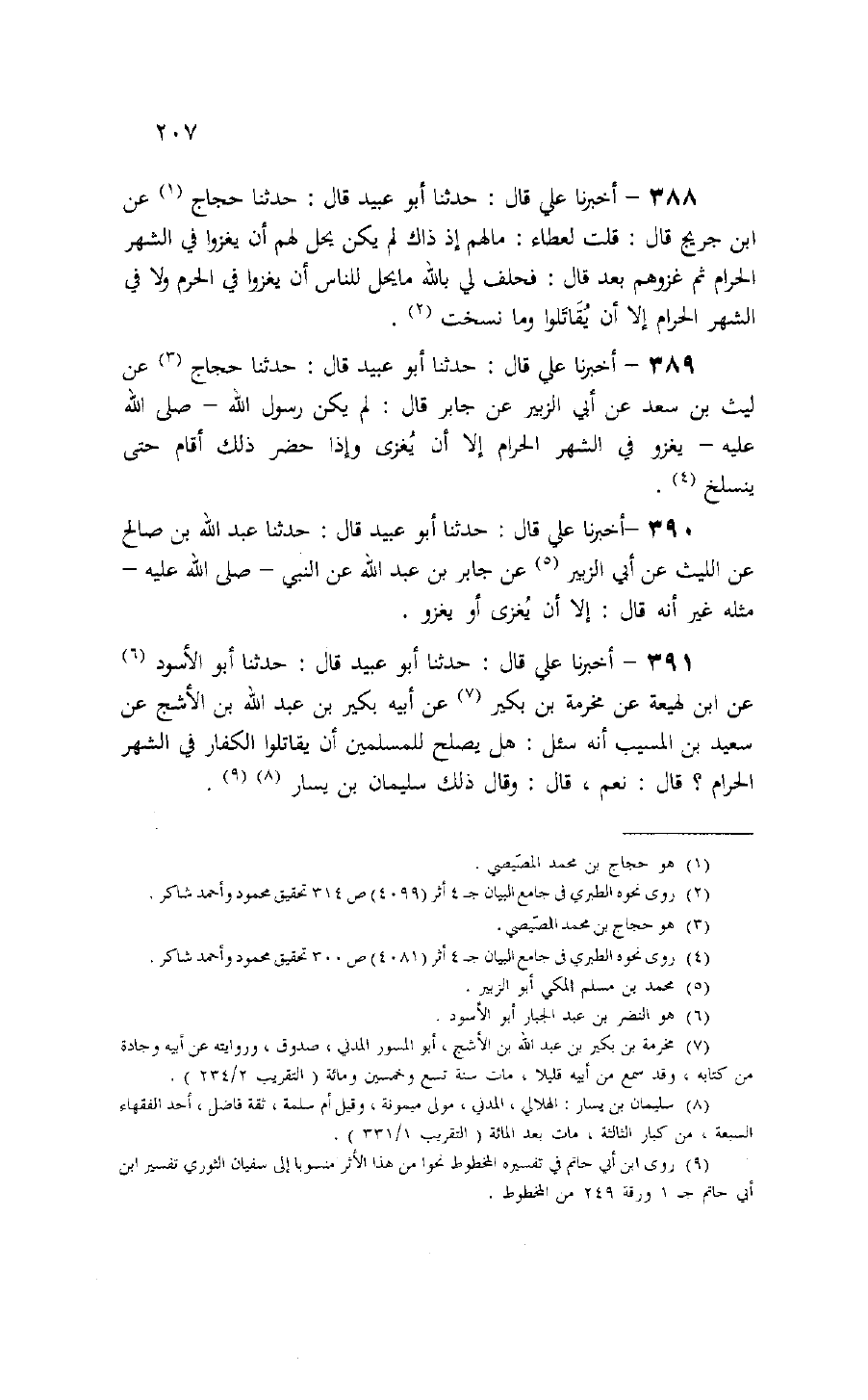 391 - أخبرنا علي قال: حدثنا أبو عبيد قال: حدثنا أبو الأسود (¬6) عن ابن لهيعة عن مخرمة بن بكير (¬7) عن أبيه بكير بن عبد الله بن الأشج عن سعيد بن المسيب أنه سئل: هل يصلح للمسلمين أن يقاتلوا الكفار في الشهر الحرام؟ قال: نعم، قال: وقال ذلك سليمان بن يسار (¬8) (¬9).