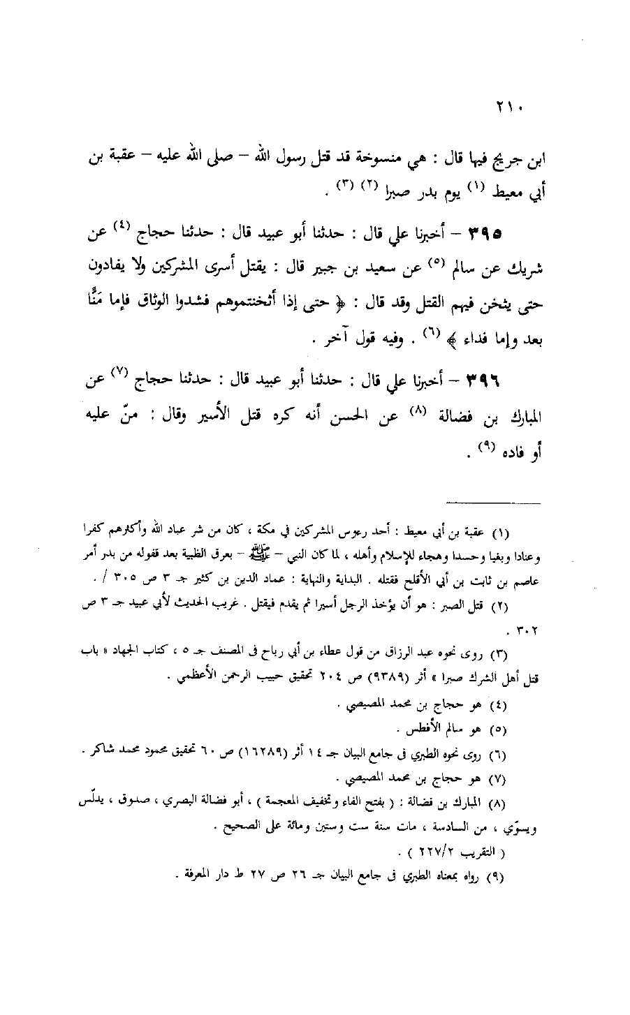 396 - أخبرنا علي قال: حدثنا أبو عبيد قال: حدثنا حجاج (¬7) عن المبارك بن فضالة (¬8) عن الحسن أنه كره قتل الأسير وقال: منّ عليه أو فاده (¬9).