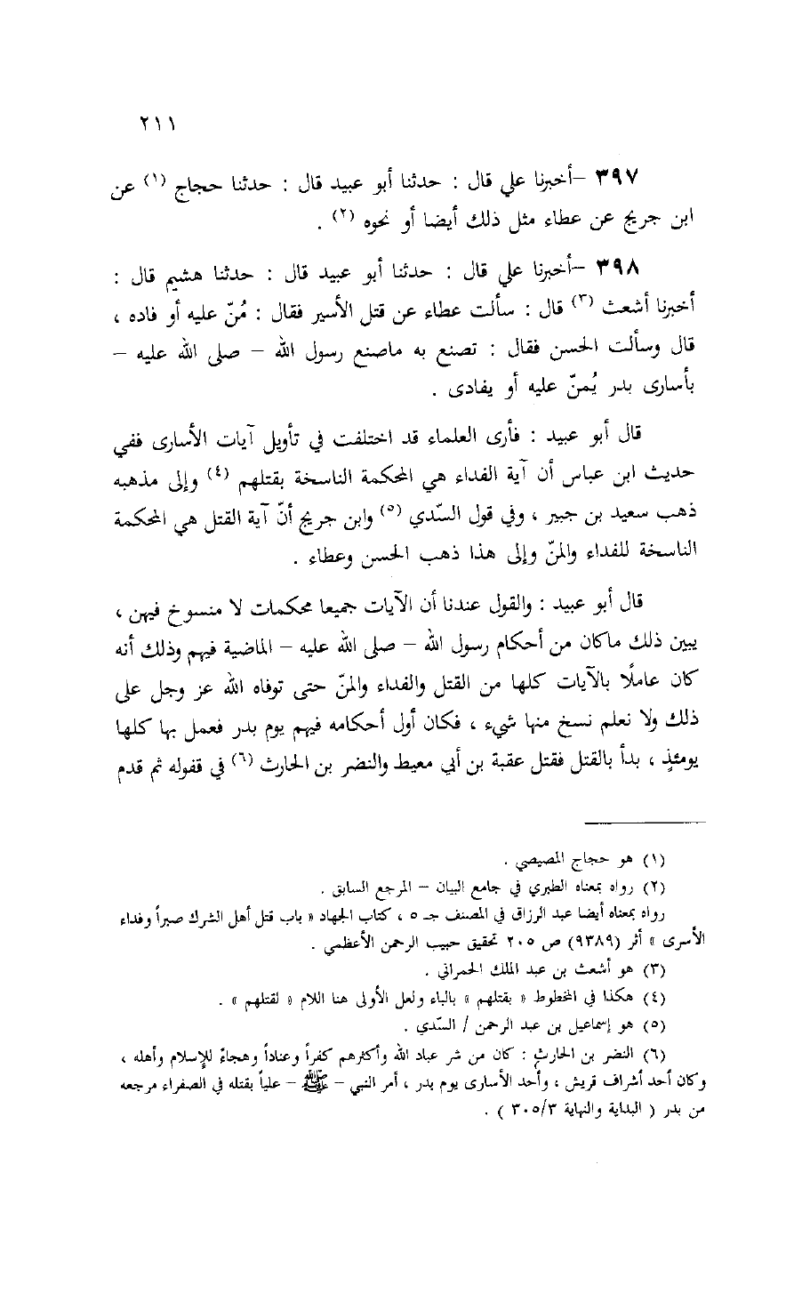 قال أبو عبيد: والقول عندنا أن الآيات جميعا محكمات لا منسوخ فيهن، يبين ذلك ما كان من أحكام رسول الله- صلى الله عليه- الماضية فيهم وذلك أنه كان عاملا بالآيات كلها من القتل والفداء والمنّ حتى توفاه الله عز وجل على ذلك ولا نعلم نسخ منها شيء، فكان أول أحكامه فيهم يوم بدر فعمل بها كلها يومئذ، بدأ بالقتل فقتل عقبة بن أبي معيط والنضر بن الحارث (¬6) في قفوله ثم قدم