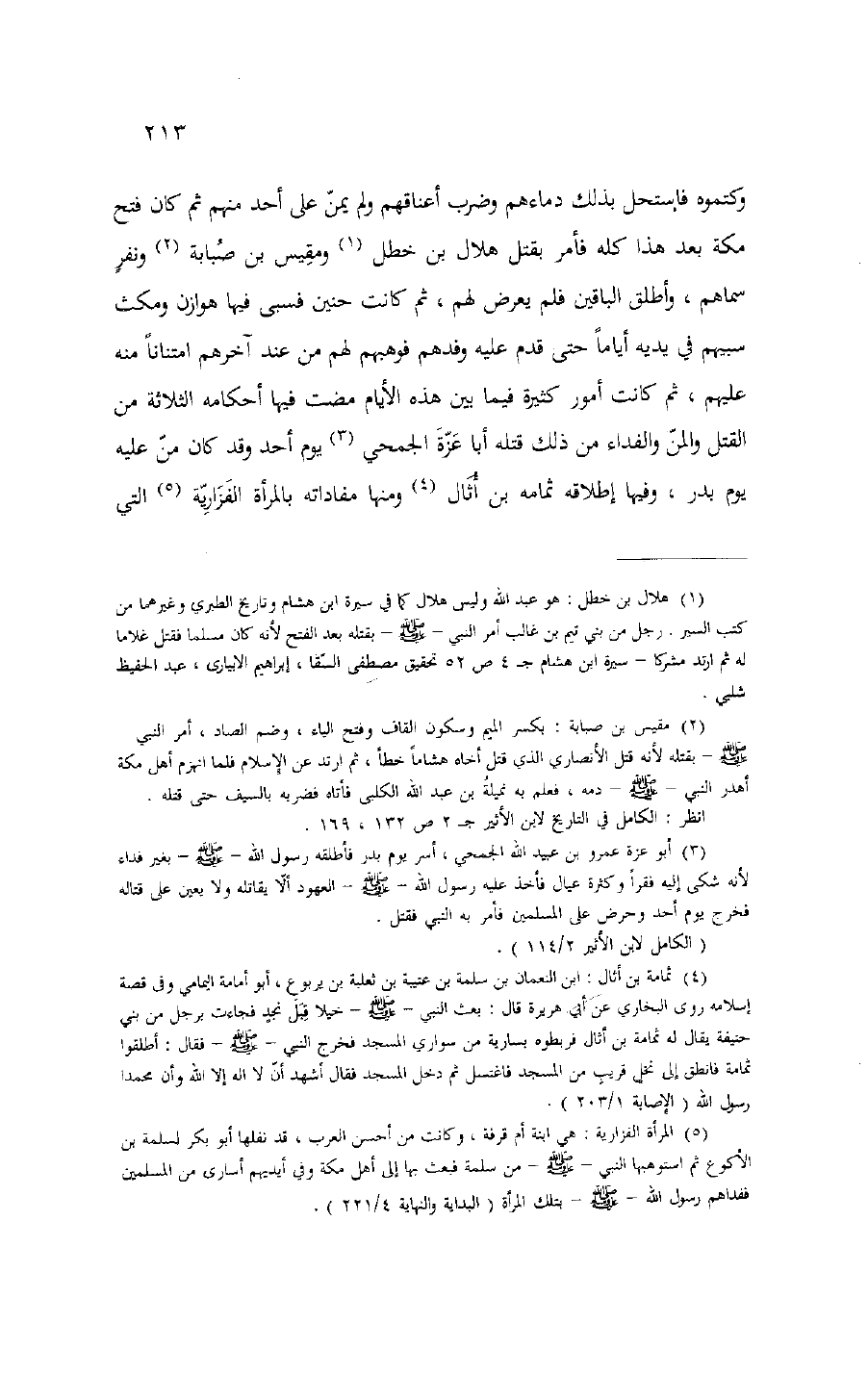 (¬5) المرأة الفزارية: هي ابنة أم قرفة، وكانت من أحسن العرب، قد نفلها أبو بكر لسلمة بن الأكوع ثم استوهبها النبي- صلّى الله عليه وسلم- من سلمة فبعث بها إلى أهل مكة وفي أيديهم أسارى من المسلمين ففداهم رسول الله- صلّى الله عليه وسلم- بتلك المرأة (البداية والنهاية 4/ 221).