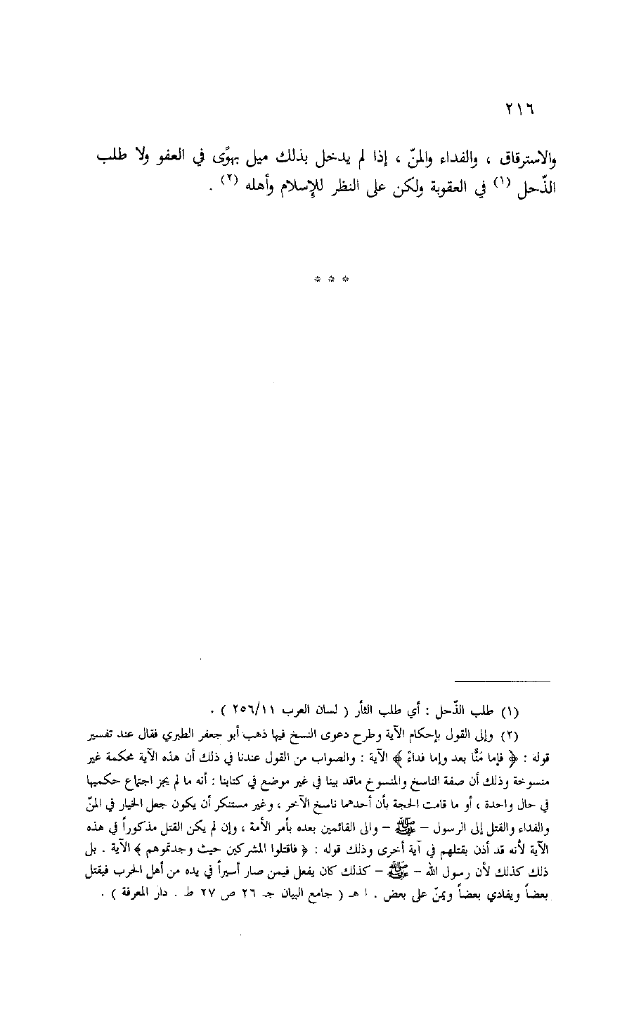 (¬2) وإلى القول بإحكام الآية وطرح دعوى النسخ فيها ذهب أبو جعفر الطبري فقال عند تفسير قوله: فَإِمَّا مَنًّا بَعْدُ وَإِمَّا فِداءً الآية: والصواب من القول عندنا في ذلك أن هذه الآية محكمة غير منسوخة وذلك أن صفة الناسخ والمنسوخ ما قد بينا في غير موضع في كتابنا: أنه ما لم يجز اجتماع حكميها في حال واحدة، أو ما قامت الحجة بأن أحدهما ناسخ الآخر، وغير مستنكر أن يكون جعل الخيار في المنّ والفداء والقتل إلى الرسول- صلّى الله عليه وسلم- والى القائمين بعده بأمر الأمة، وإن لم يكن القتل مذكورا في هذه الآية لأنه قد أذن بقتلهم في آية أخرى وذلك قوله: فَاقْتُلُوا الْمُشْرِكِينَ حَيْثُ وَجَدْتُمُوهُمْ الآية. بل ذلك كذلك لأن رسول الله- صلّى الله عليه وسلم- كذلك كان يفعل فيمن صار أسيرا في يده من أهل الحرب فيقتل بعضا ويفادي بعضا ويمنّ على بعض. اهـ (جامع البيان ج 26 ص 27 ط. دار المعرفة).