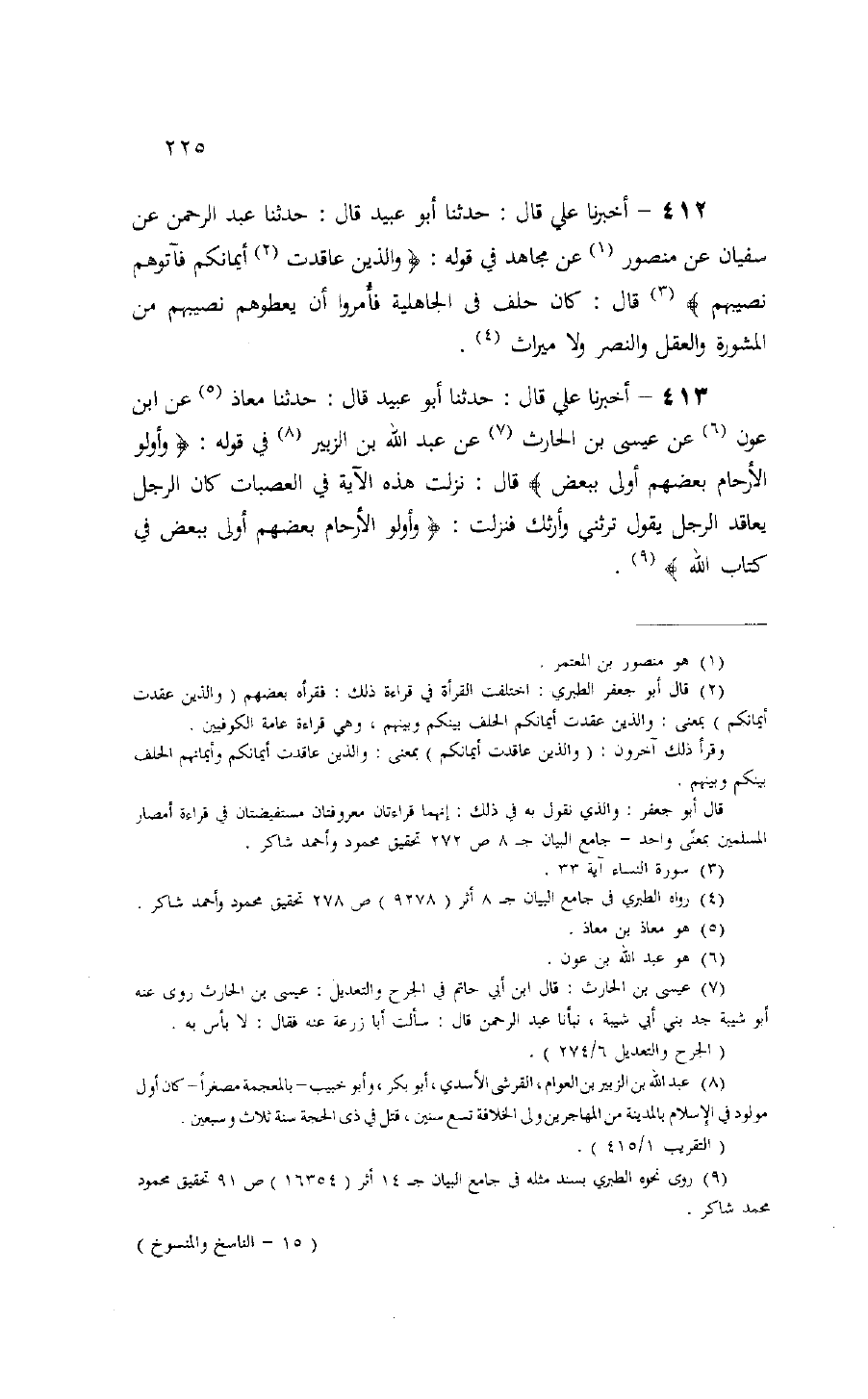 413 - أخبرنا علي قال: حدثنا أبو عبيد قال: حدثنا معاذ (¬5) عن ابن عون (¬6) عن عيسى بن الحارث (¬7) عن عبد الله بن الزبير (¬8) في قوله: وَأُولُوا الْأَرْحامِ بَعْضُهُمْ أَوْلى بِبَعْضٍ قال: نزلت هذه الآية في العصبات كان الرجل يعاقد الرجل يقول ترثني وأرثك فنزلت: وَأُولُوا الْأَرْحامِ بَعْضُهُمْ أَوْلى بِبَعْضٍ فِي كِتابِ اللَّهِ (¬9).