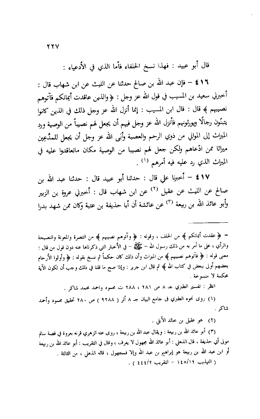 معنى قوله: فَآتُوهُمْ نَصِيبَهُمْ من الميراث وأن ذلك كان حكما ثم نسخ بقوله: وَأُولُوا الْأَرْحامِ بَعْضُهُمْ أَوْلى بِبَعْضٍ فِي كِتابِ اللَّهِ ثم قال ابن جرير: وإذا صح ما قلنا في ذلك وجب أن تكون الآية محكمة لا منسوخة.