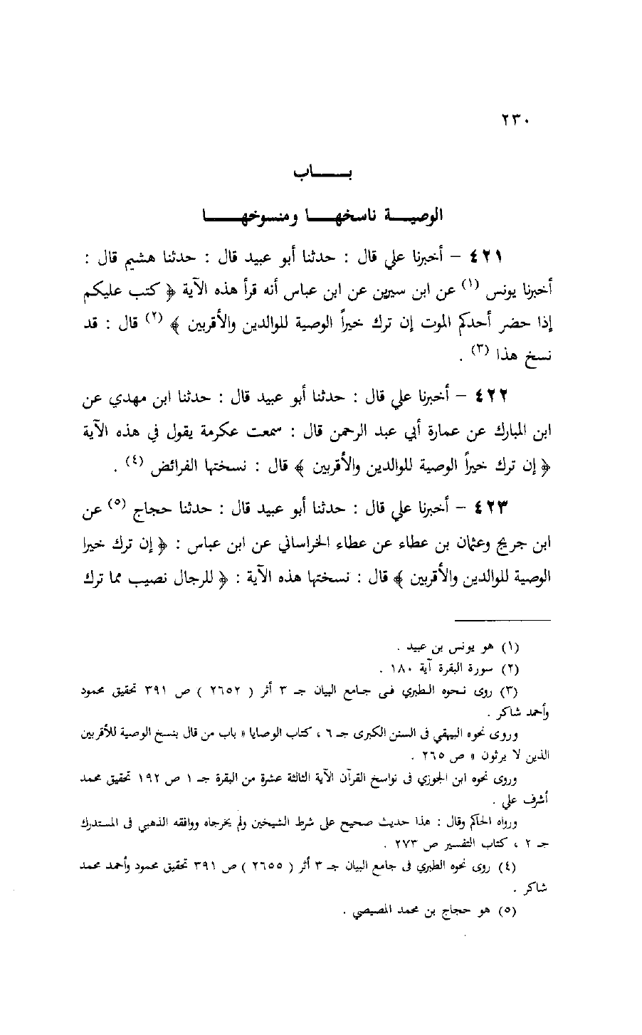 422 - أخبرنا علي قال: حدثنا أبو عبيد قال: حدثنا ابن مهدي عن ابن المبارك عن عمارة أبي عبد الرحمن قال: سمعت عكرمة يقول في هذه الآية إِنْ تَرَكَ خَيْراً الْوَصِيَّةُ لِلْوالِدَيْنِ وَقال: نسختها الفرائض (¬4).