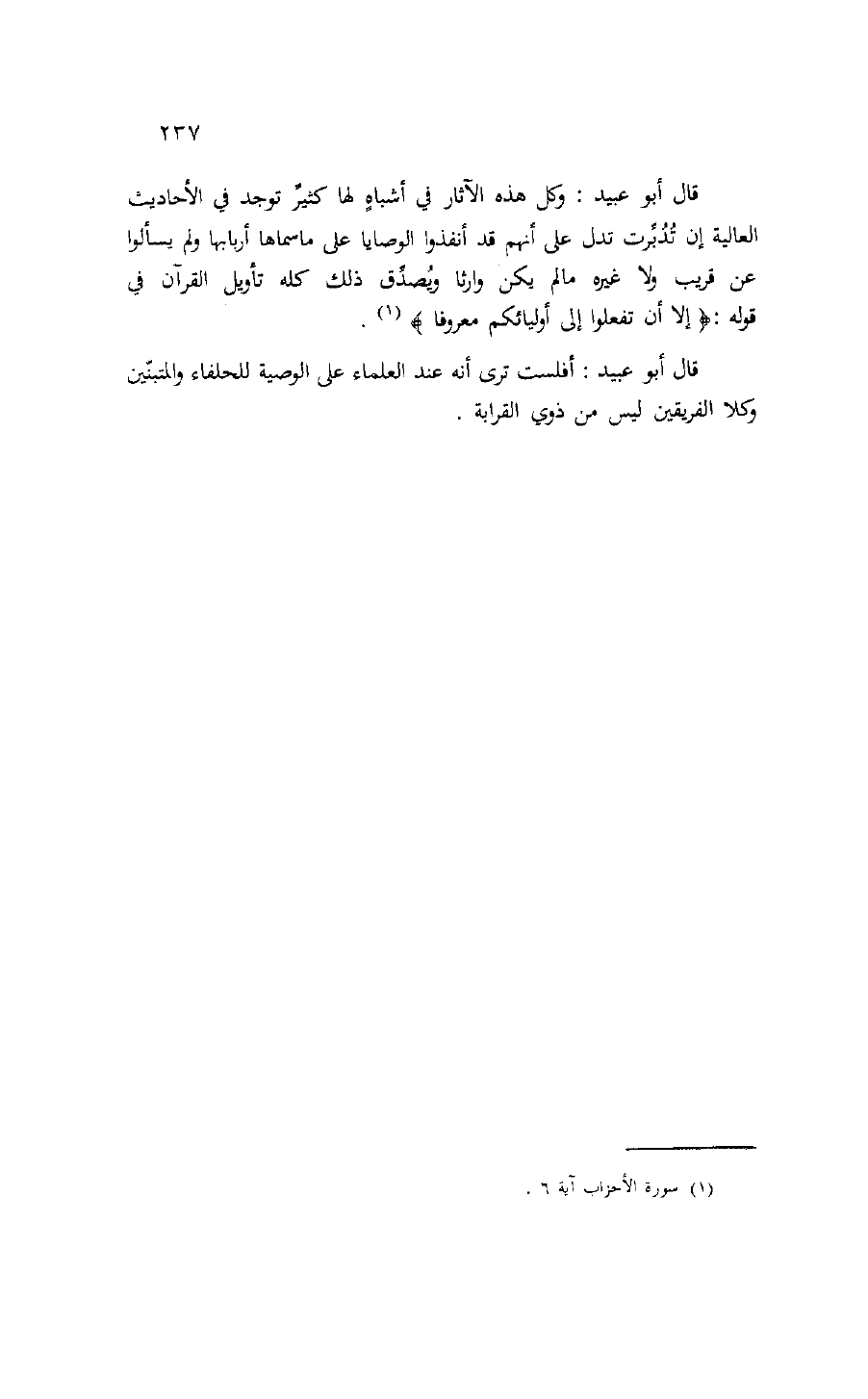 قال أبو عبيد: وكل هذه الآثار في أشباه لها كثير توجد في الأحاديث العالية إن تدبّرت تدل على أنهم قد أنفذوا الوصايا على ما سماها أربابها ولم يسألوا عن قريب ولا غيره ما لم يكن وارثا ويصدّق ذلك كله تأويل القرآن في قوله: إِلَّا أَنْ تَفْعَلُوا إِلى أَوْلِيائِكُمْ مَعْرُوفاً (¬1).