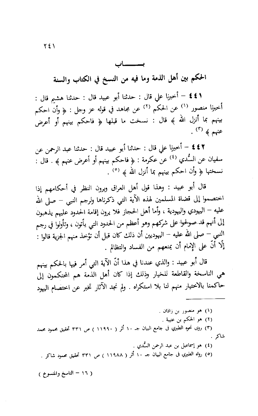 قال أبو عبيد: والذي عندنا في هذا أنّ الآية التي أمر فيها بالحكم بينهم هي الناسخة والقاطعة للخيار وذلك إذا كان أهل الذمة هم المحتكمون إلى حاكمنا بالاختيار منهم لنا بلا استكراه. ولم نجد الآثار تخبر عن اختصام اليهود