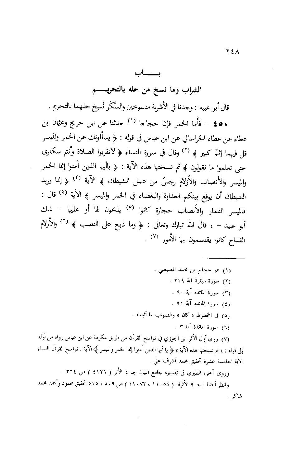 450 - فأما الخمر فإن حجاجا (¬1) حدثنا عن ابن جريج وعثمان بن عطاء عن عطاء الخراساني عن ابن عباس في قوله: يَسْئَلُونَكَ عَنِ الْخَمْرِ وَالْمَيْسِرِ قُلْ فِيهِما إِثْمٌ كَبِيرٌ (¬2) وقال في سورة النساء لا تَقْرَبُوا الصَّلاةَ وَأَنْتُمْ سُكارى حَتَّى تَعْلَمُوا ما تَقُولُونَ ثم نسختها هذه الآية: يا أَيُّهَا الَّذِينَ آمَنُوا إِنَّمَا الْخَمْرُ وَالْمَيْسِرُ وَالْأَنْصابُ وَالْأَزْلامُ رِجْسٌ مِنْ عَمَلِ الشَّيْطانِ الآية (¬3) إِنَّما يُرِيدُ الشَّيْطانُ أَنْ يُوقِعَ بَيْنَكُمُ الْعَداوَةَ وَالْبَغْضاءَ فِي الْخَمْرِ وَالْمَيْسِرِ الآية (¬4) قال: