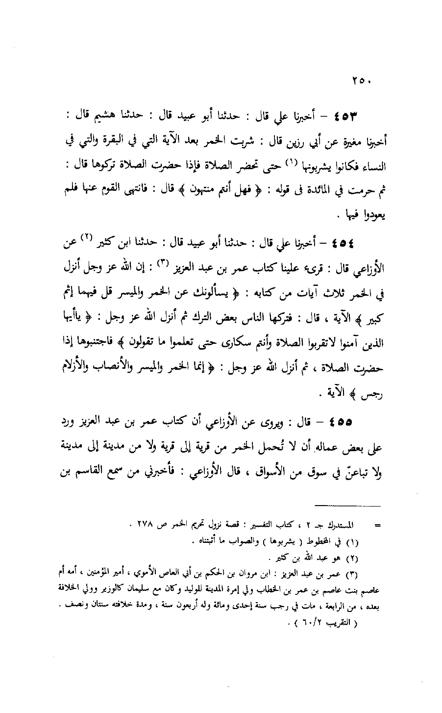 454 - أخبرنا علي قال: حدثنا أبو عبيد قال: حدثنا ابن كثير (¬2) عن الأوزاعي قال: قرئ علينا كتاب عمر بن عبد العزيز (¬3): إن الله عز وجل أنزل في الخمر ثلاث آيات من كتابه: يَسْئَلُونَكَ عَنِ الْخَمْرِ وَالْمَيْسِرِ قُلْ فِيهِما إِثْمٌ كَبِيرٌ الآية، قال: فتركها الناس بعض الترك ثم أنزل الله عز وجل: يا أَيُّهَا الَّذِينَ آمَنُوا لا تَقْرَبُوا الصَّلاةَ وَأَنْتُمْ سُكارى حَتَّى تَعْلَمُوا ما تَقُولُونَ فاجتنبوها إذا حضرت الصلاة، ثم أنزل الله عز وجل: إِنَّمَا الْخَمْرُ وَالْمَيْسِرُ وَالْأَنْصابُ وَالْأَزْلامُ رِجْسٌ الآية.