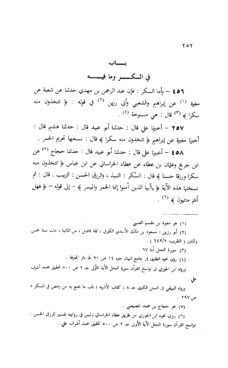 456 - وأما السكر: فإن عبد الرحمن بن مهدي حدثنا عن شعبة عن مغيرة (¬1) عن إبراهيم والشعبي وأبي رزين (¬2) في قوله: تَتَّخِذُونَ مِنْهُ سَكَراً (¬3) قال: هي منسوخة (¬4).