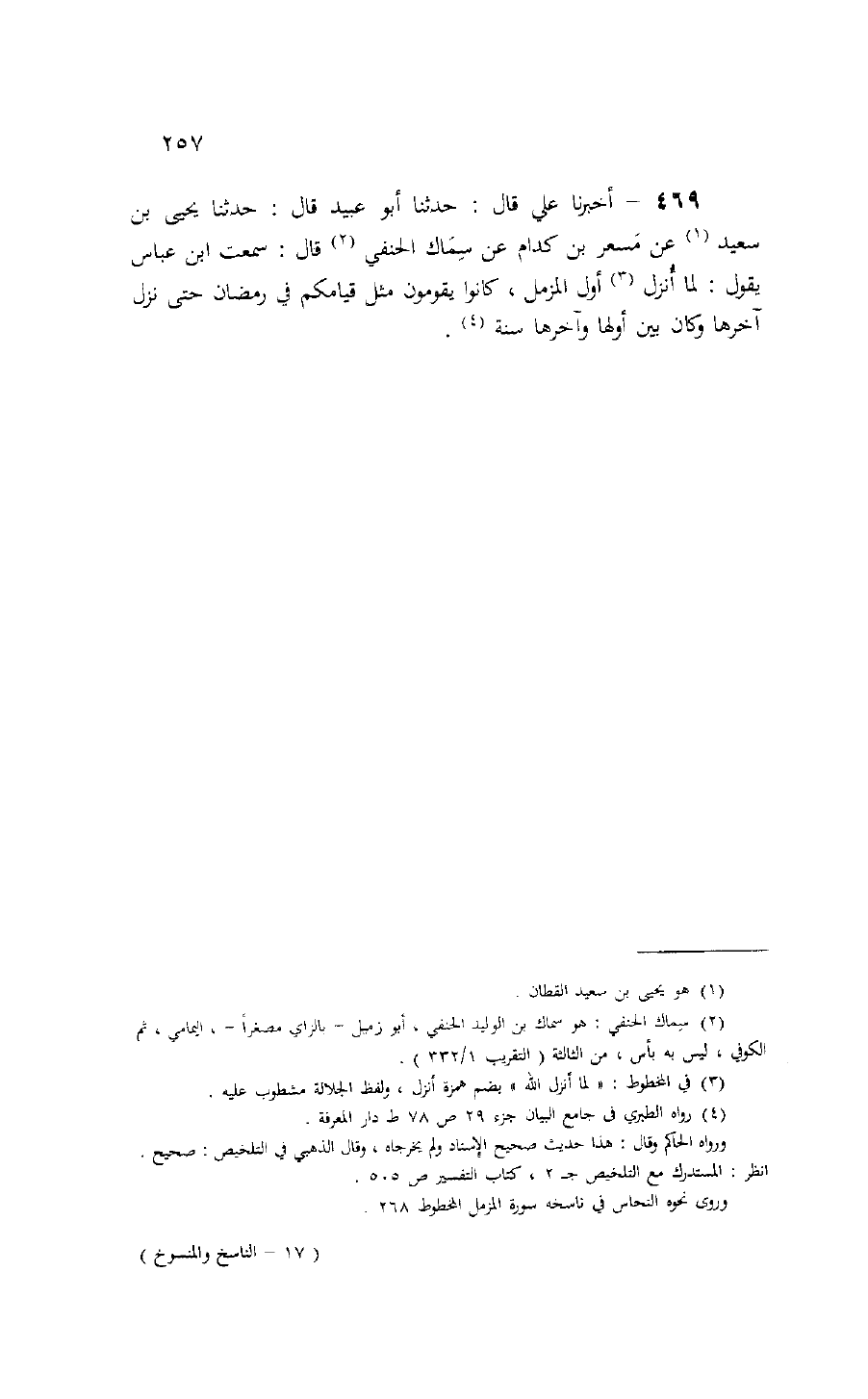 469 - أخبرنا علي قال: حدثنا أبو عبيد قال: حدثنا يحيى بن سعيد (¬1) عن مسعر بن كدام عن سماك الحنفي (¬2) قال: سمعت ابن عباس يقول: لما أنزل (¬3) أول المزمل، كانوا يقومون مثل قيامكم في رمضان حتى نزل آخرها وكان بين أولها وآخرها سنة (¬4).