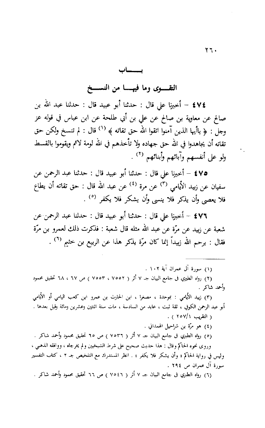 475 - أخبرنا علي قال: حدثنا أبو عبيد قال: حدثنا عبد الرحمن عن سفيان عن زبيد الأيامي (¬3) عن مرة (¬4) عن عبد الله قال: حق تقاته أن يطاع فلا يعصى وأن يذكر فلا ينسى وأن يشكر فلا يكفر (¬5).