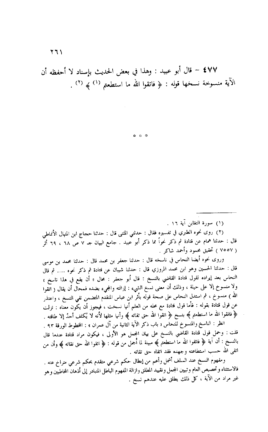 477 - قال أبو عبيد: وهذا في بعض الحديث بإسناد لا أحفظه أن الآية منسوخة نسخها قوله: فَاتَّقُوا اللَّهَ مَا اسْتَطَعْتُمْ (¬1) (¬2).