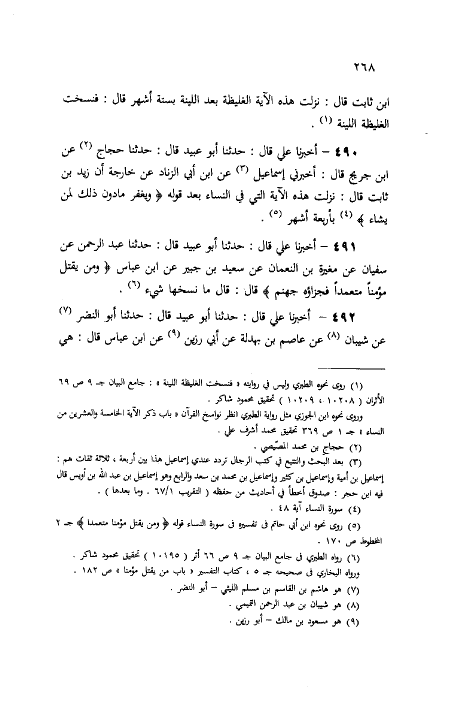 وروى نحوه ابن الجوزي مثل رواية الطبري انظر نواسخ القرآن «باب ذكر الآية الخامسة والعشرين من النساء» ج 1 ص 369 تحقيق محمد أشرف علي.