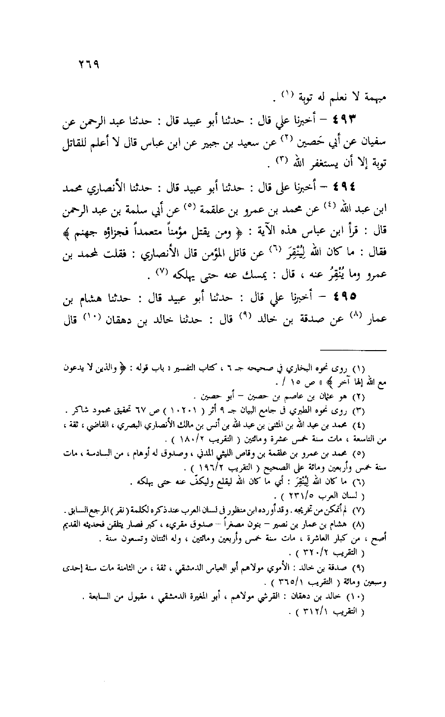 493 - أخبرنا علي قال: حدثنا أبو عبيد قال: حدثنا عبد الرحمن عن سفيان عن أبي حصين (¬2) عن سعيد بن جبير عن ابن عباس قال لا أعلم للقاتل توبة إلا أن يستغفر الله (¬3).