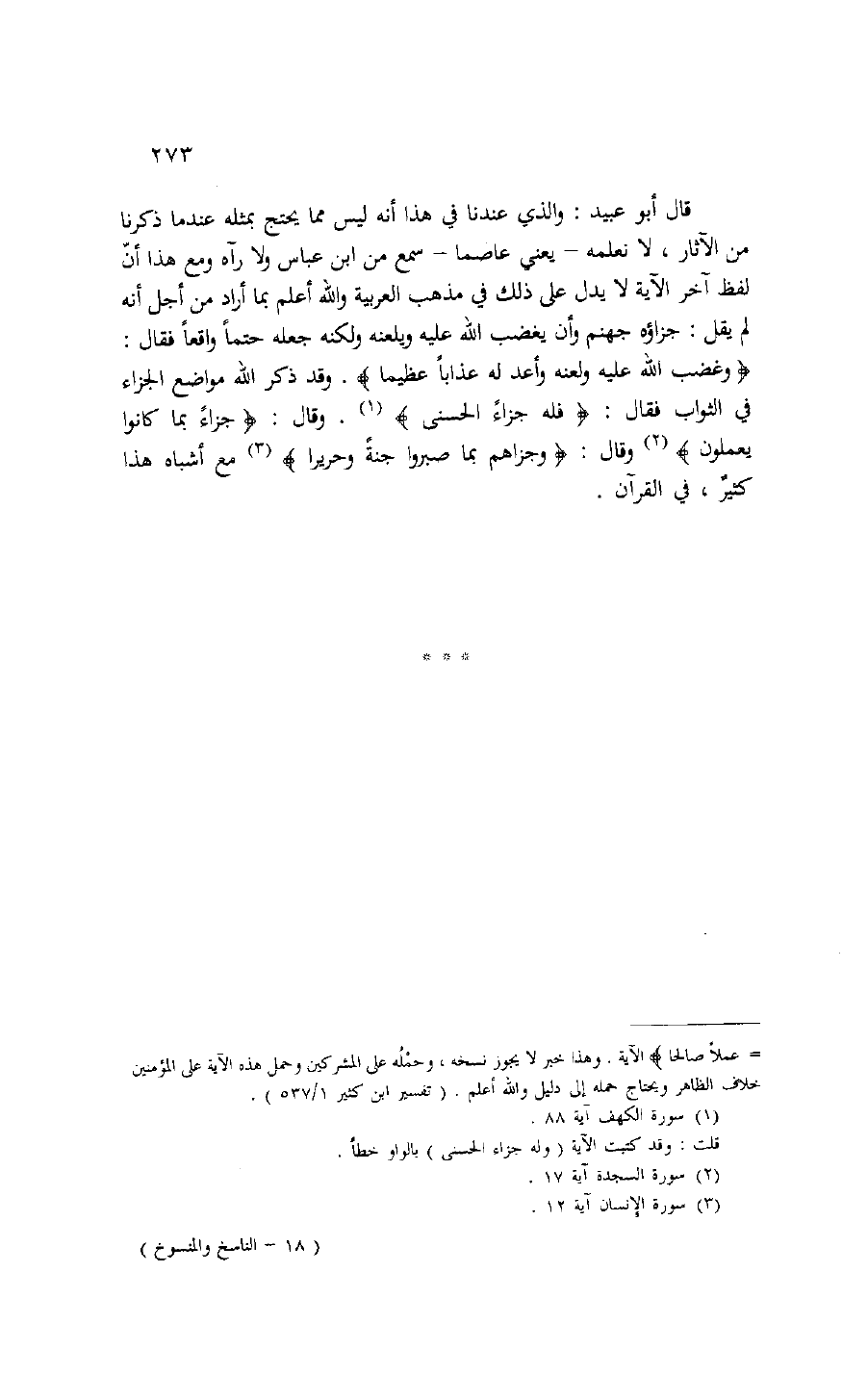 - عَمَلًا صالِحاً الآية. وهذا خبر لا يجوز نسخه، وحمله على المشركين وحمل هذه الآية على المؤمنين خلاف الظاهر ويحتاج حمله إلى دليل والله أعلم. (تفسير ابن كثير 1/ 537).
