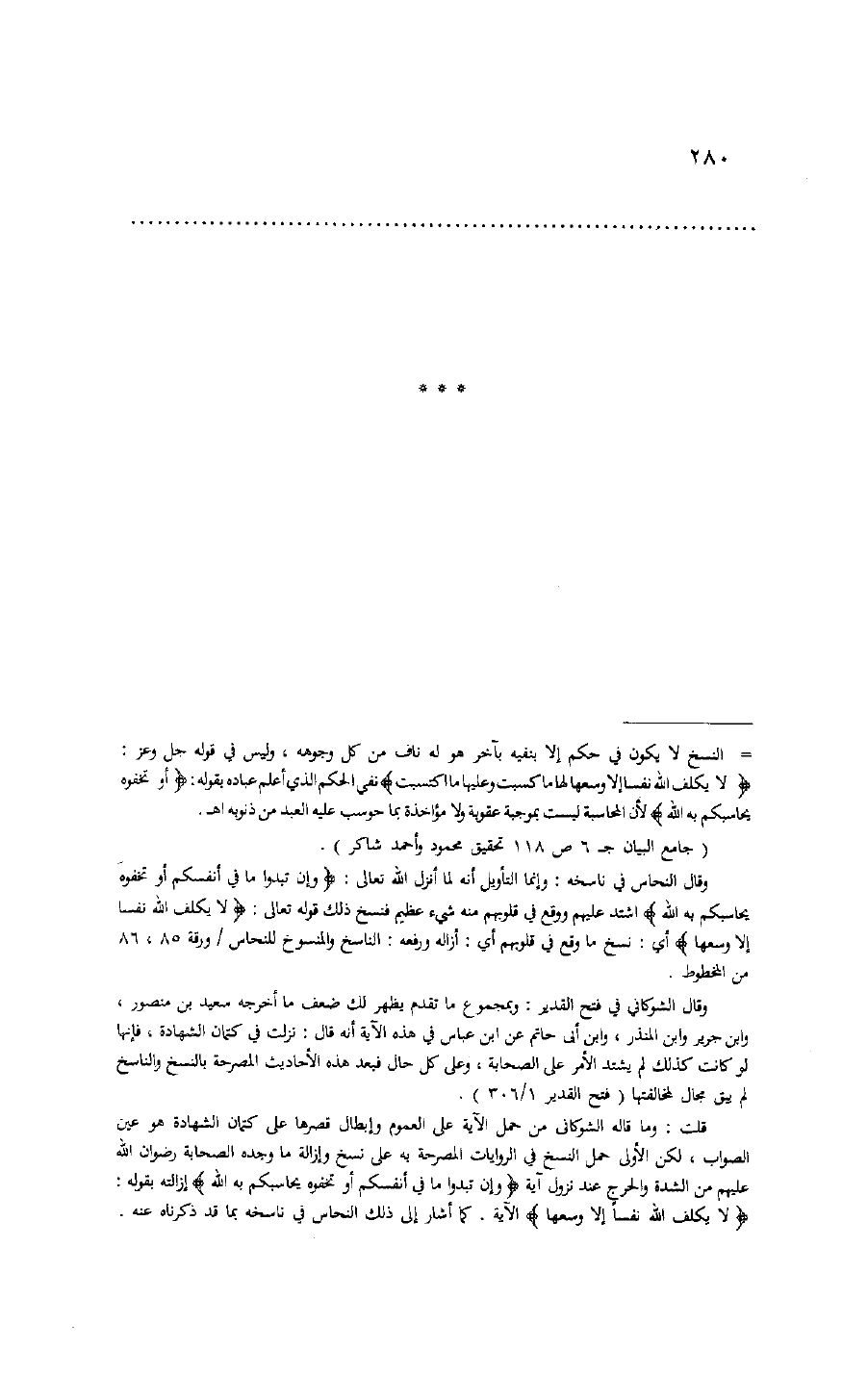 وقال النحاس في ناسخه: وإنما التأويل أنه لما أنزل الله تعالى: وَإِنْ تُبْدُوا ما فِي أَنْفُسِكُمْ أَوْ تُخْفُوهُ يُحاسِبْكُمْ بِهِ اللَّهُ اشتد عليهم ووقع في قلوبهم منه شيء عظيم فنسخ ذلك قوله تعالى: لا يُكَلِّفُ اللَّهُ نَفْساً إِلَّا وُسْعَها أي: نسخ ما وقع في قلوبهم أي: أزاله ورفعه: الناسخ والمنسوخ للنحاس/ ورقة 85، 86 من المخطوط.